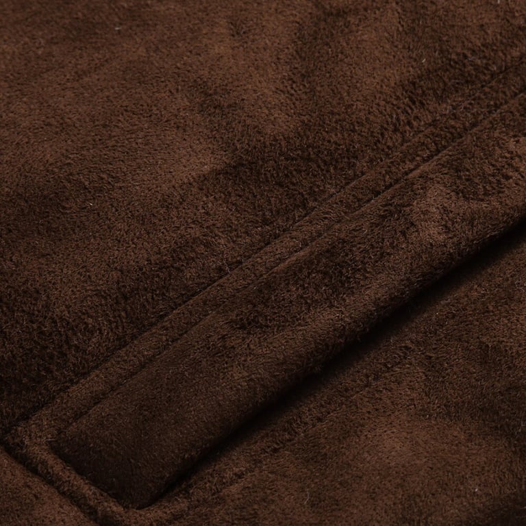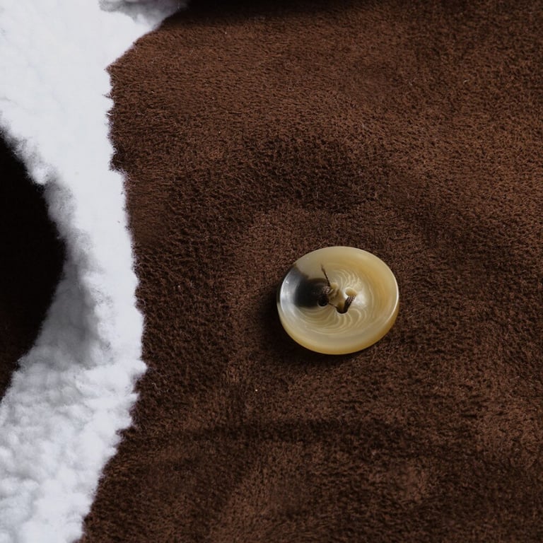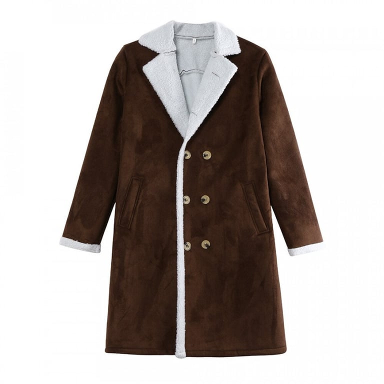 The coat has a loose fit with a collar and side pockets. Double-breasted button fastening.