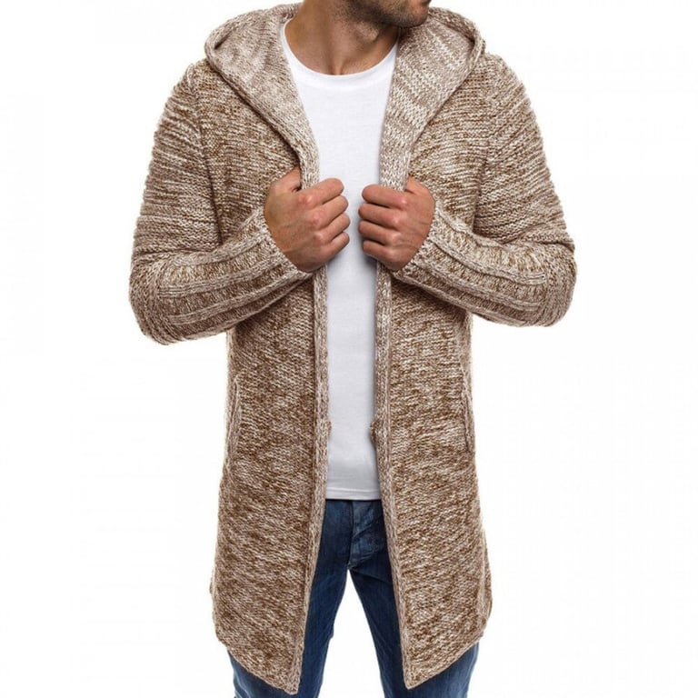 Men's knitted cardigan with collar and hood. Loose long fit. Marl pattern. Available in multiple colour options.