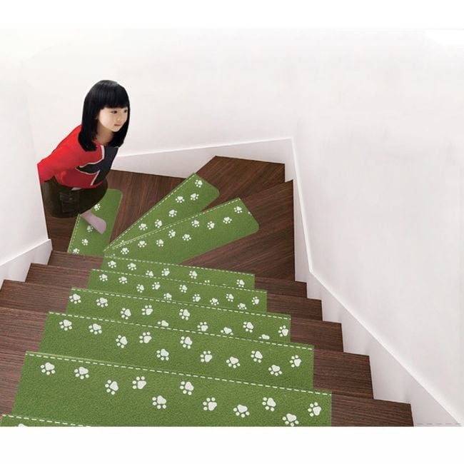 The stair mat is non-slip. The paw prints glow in the dark, so you can easily orient yourself at night and descend the stairs without any problems, without having to turn on the light. You can choose from several colours.