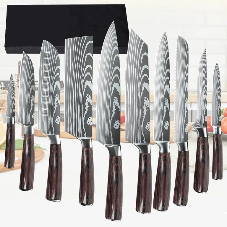 The set includes all types of knives needed for everyday cooking – from small blades for fruit and vegetables, through versatile knives, a santoku and chef's knives, up to a heavy-duty cleaver. Thanks to ergonomic handles made from durable material, handling is comfortable and safe.