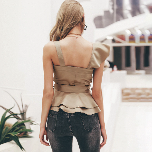 Nude lightweight summer women's top with a bow at the waist.
