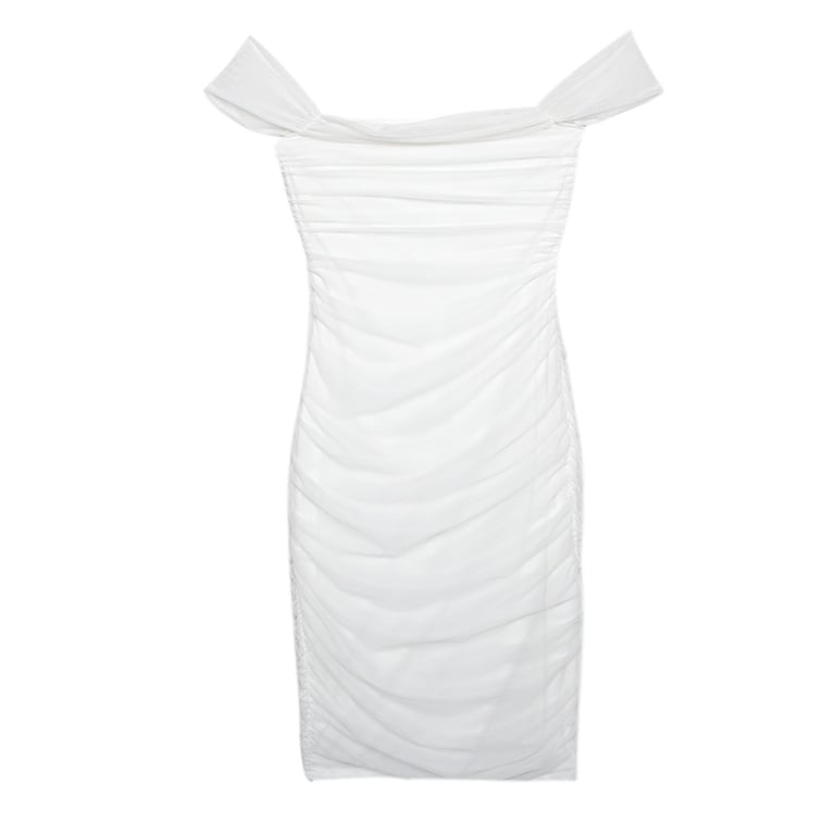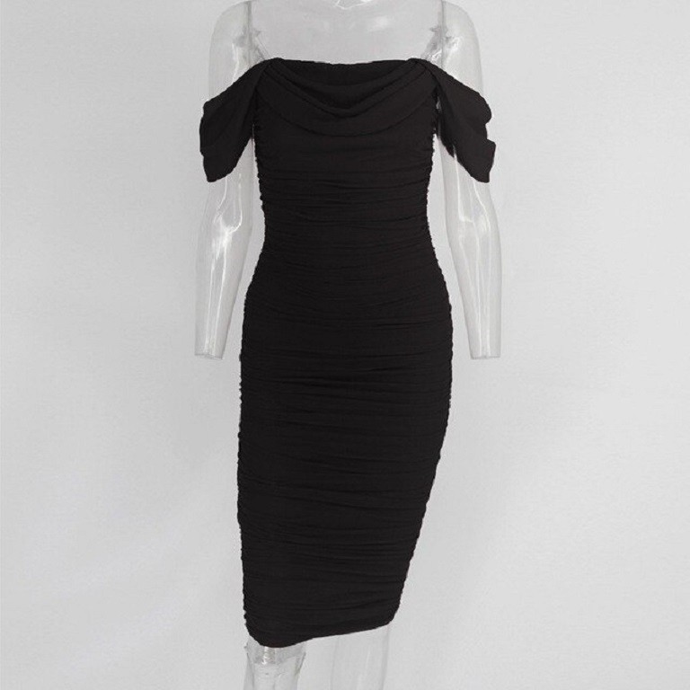 Elegant women's cocktail dress with off-the-shoulder sleeves.