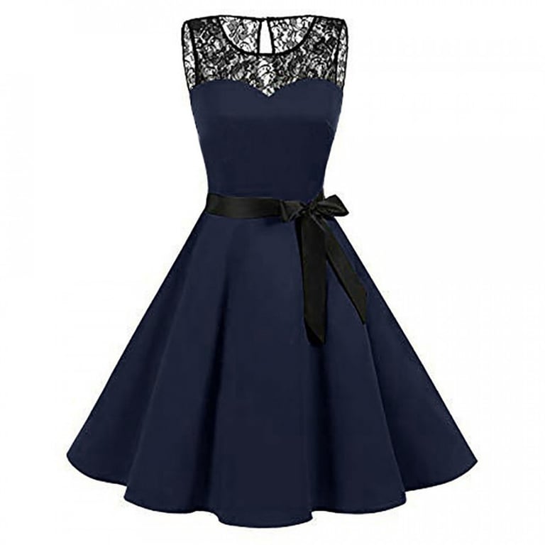 Women's sleeveless evening dress. The dress features a wide A-line skirt and a ribbon with a bow at the waist. The neckline is adorned with black lace. Available in several colours.