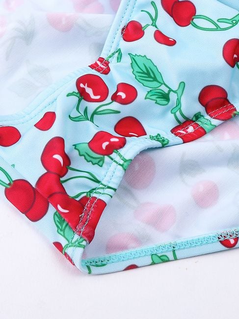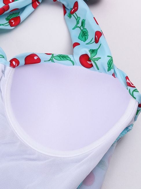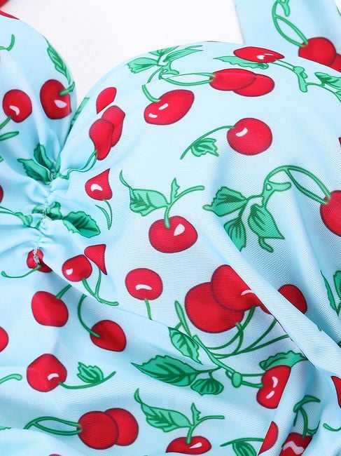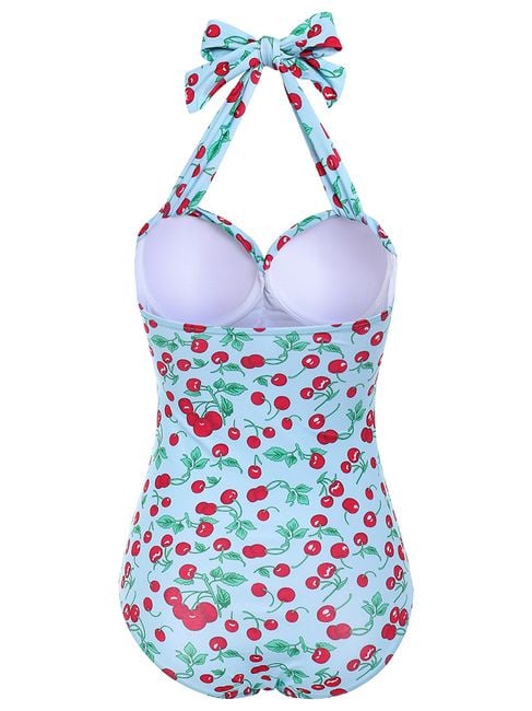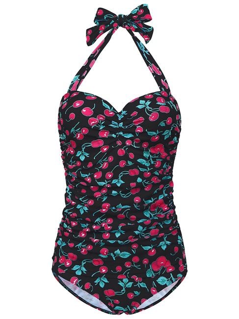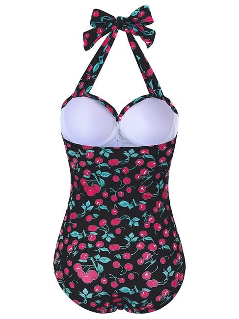 Beautiful, one-piece swimsuits with a cherry motif for all ladies. The swimsuits are available in many sizes and feature a tie with a bow at the neck. Step into summer with fashionable swimwear.