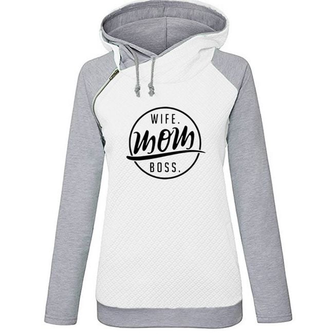 The sweatshirt is two-tone, featuring a stylish print "Wife, mom, boss". It is suitable as a very stylish accessory for everyday wear.