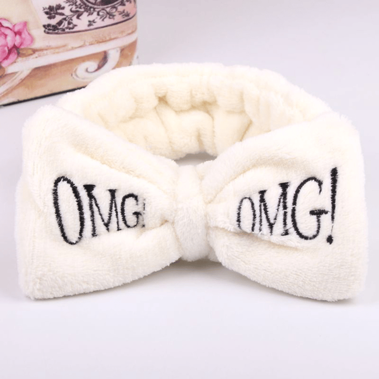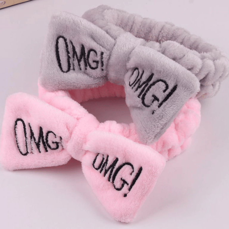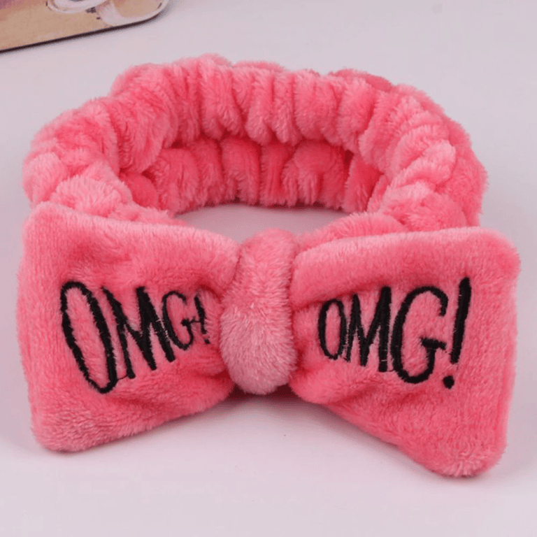 A cosmetic headband that is perfect for holding back your hair when you want to create the perfect makeup look. The headband is made of plush material and features a large bow with the inscription OMG.