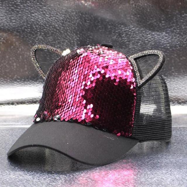 Original children's cap for girls. The cap has ears and colourful sequins. Available in various colours.