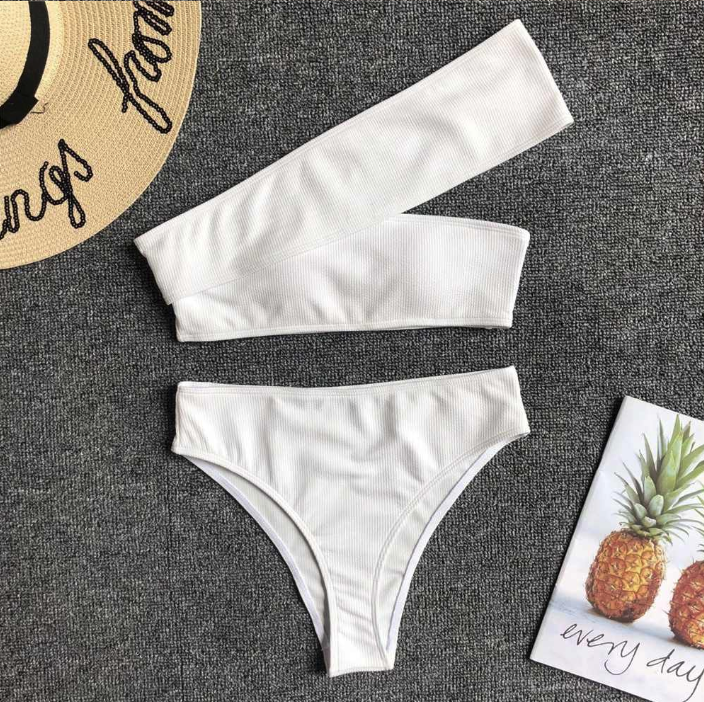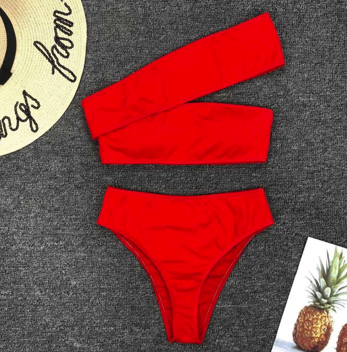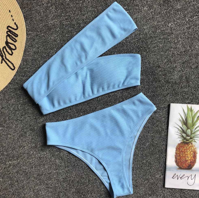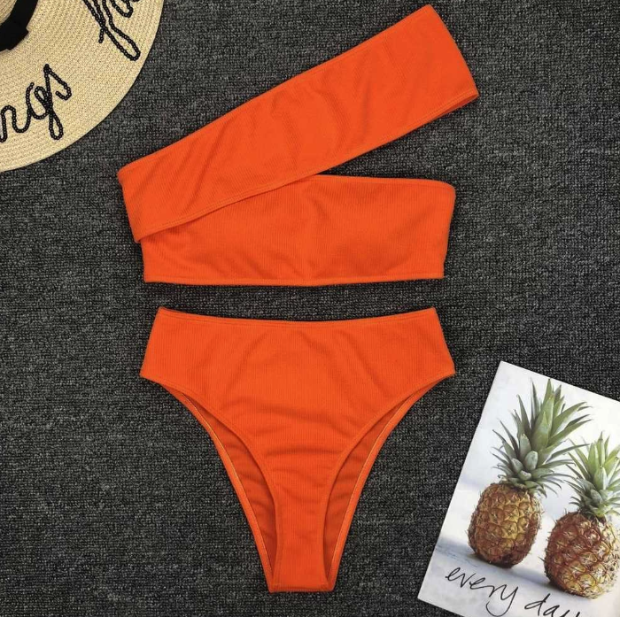 Original imaginative women's two-piece swimsuit with one shoulder.