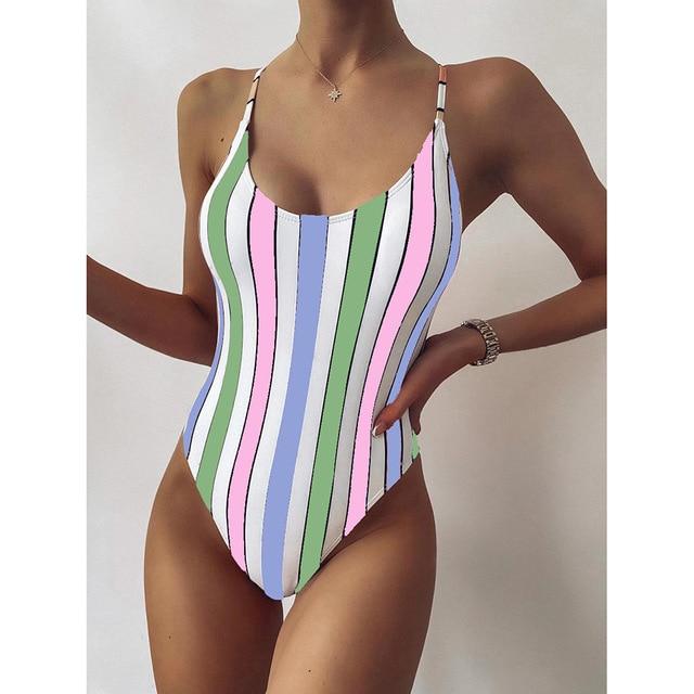 Very original one-piece swimsuit, striped design, multiple colours to choose from. The swimsuit is made from spandex and polyester.