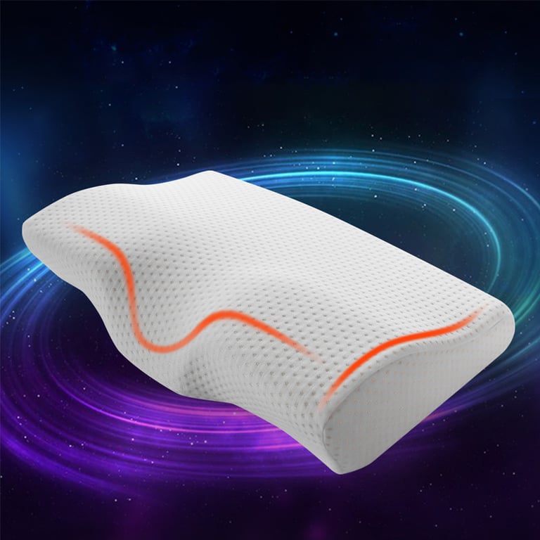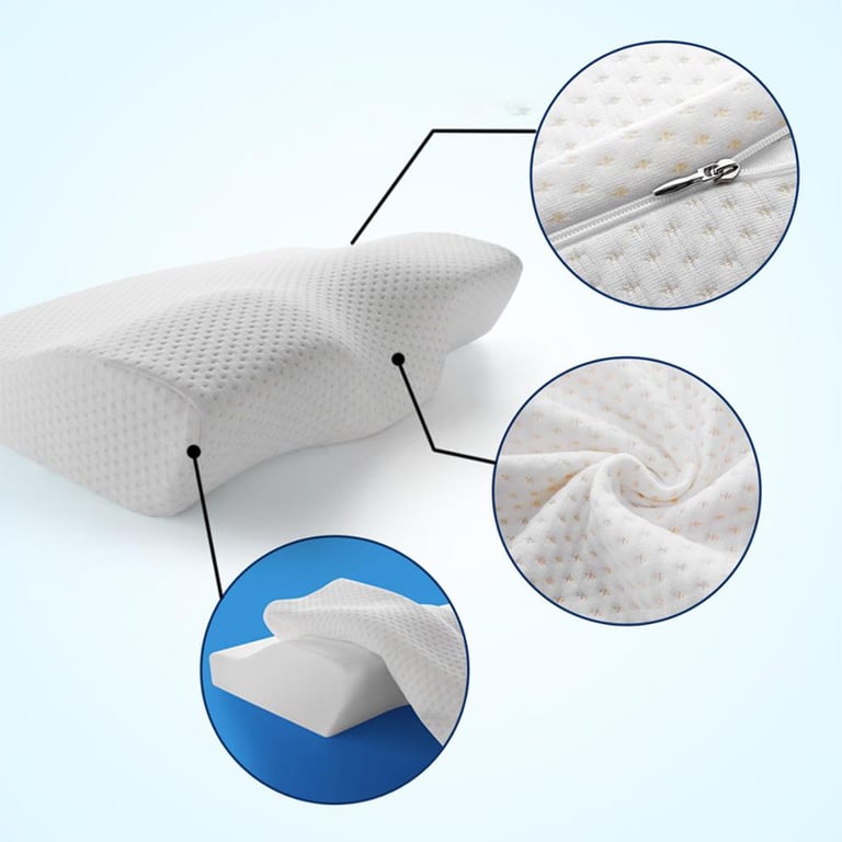 Pillow with memory foam and a washable cover. The ergonomic shape supports the neck and shoulders.