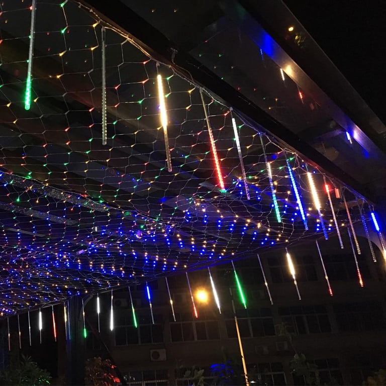 Outdoor flashing light decoration in various colours and lengths. Suitable for trees or roofs.