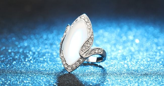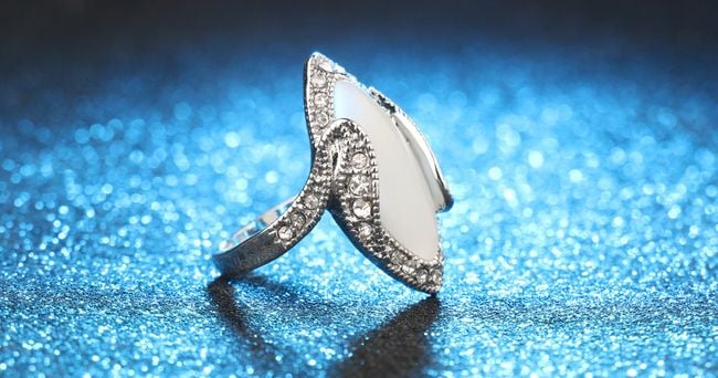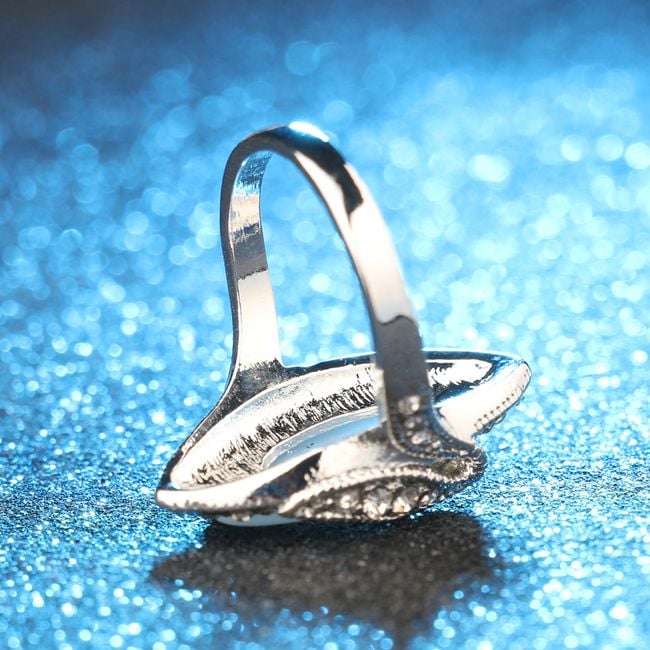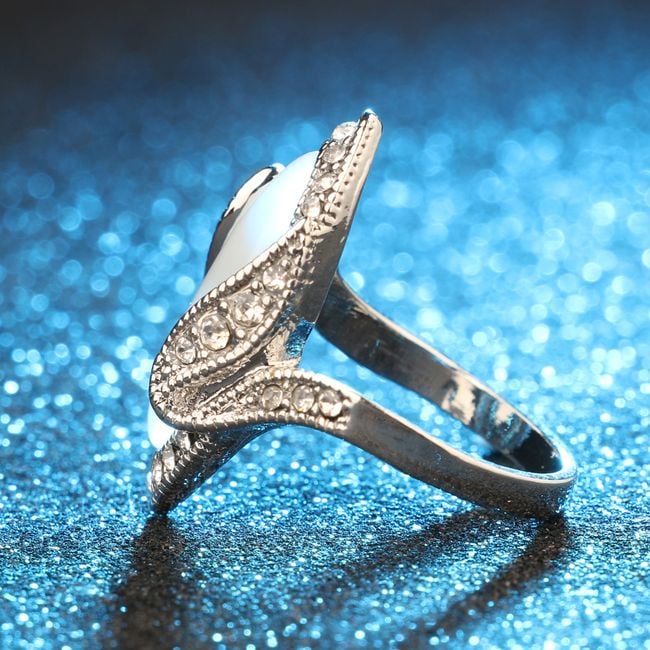 The oval-shaped ring is adorned with sparkling crystals along the edges.