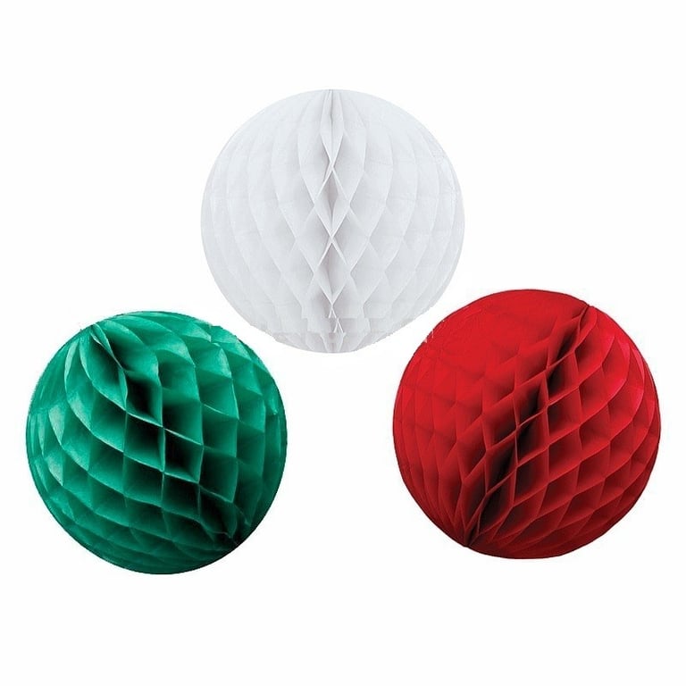 A set of paper decorative balls in various sizes in Christmas colours (red, green, white).