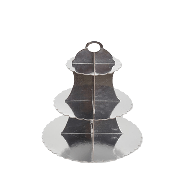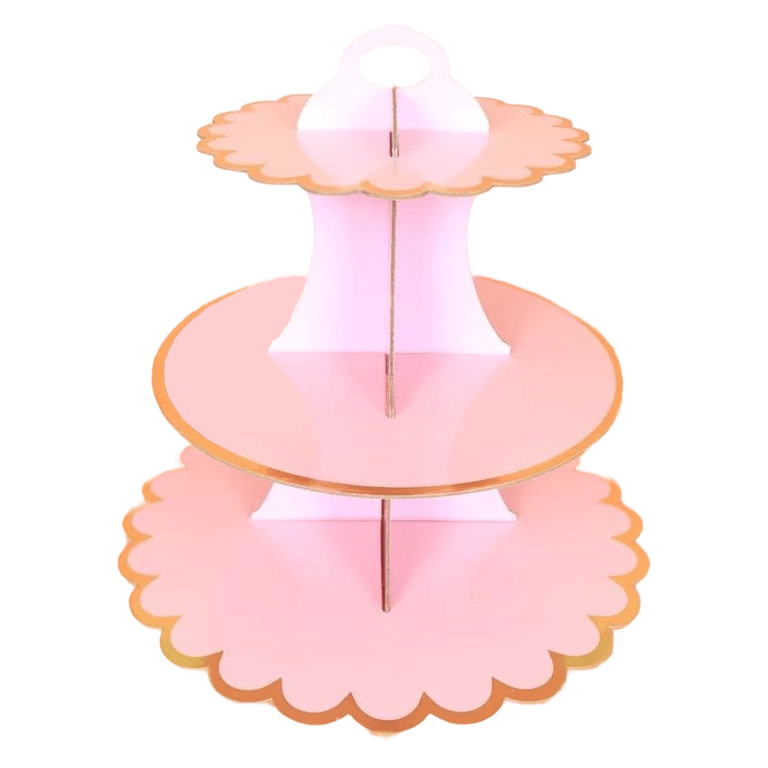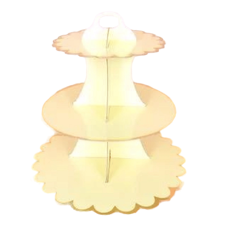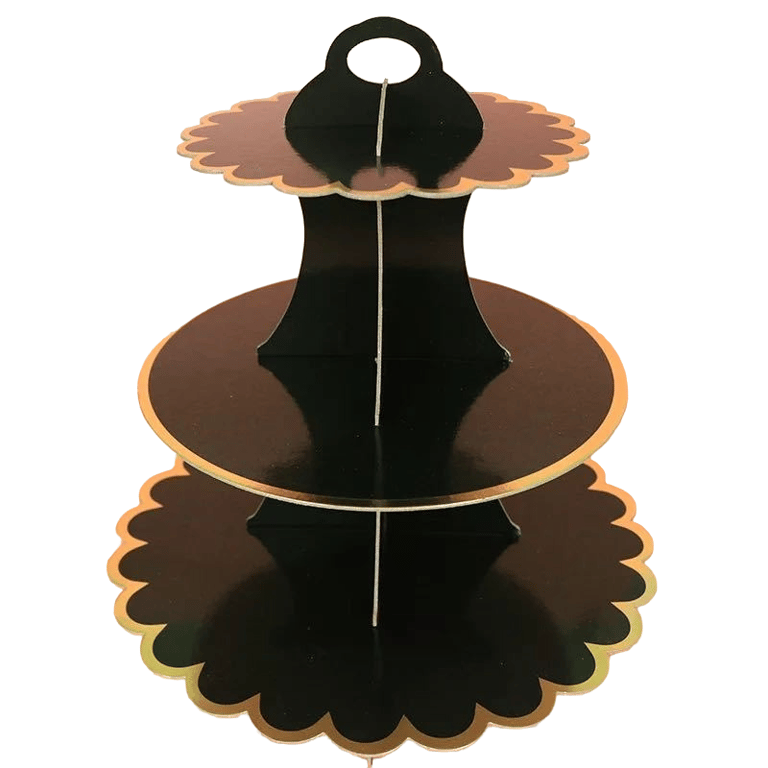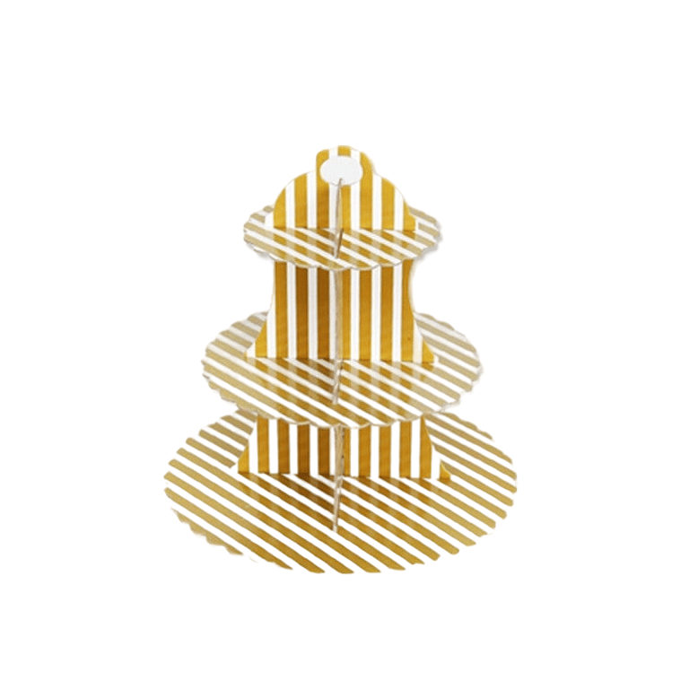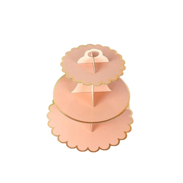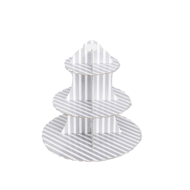 A paper dessert stand is a must-have for any celebration or party. The stand is 32 cm tall. The diameter of the first tier is 29 cm, the diameter of the second tier is 21.5 cm, and the last tier has a diameter of 16 cm. The stand is made of paper.