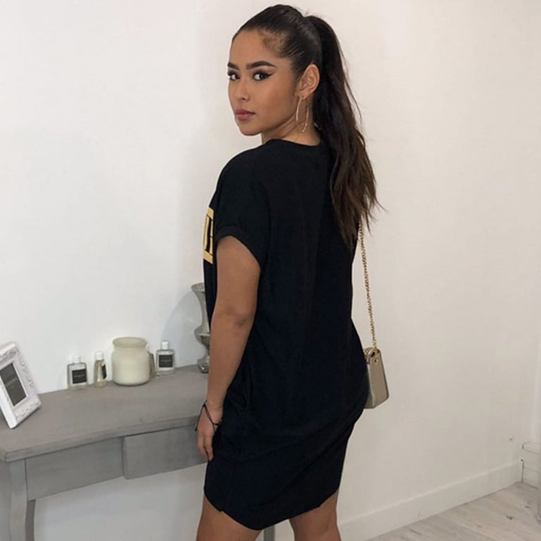 Women's stylish dress with side pockets. Loose fit with short sleeves and a round neckline. Gold print with text on the front. Available in multiple colour options.