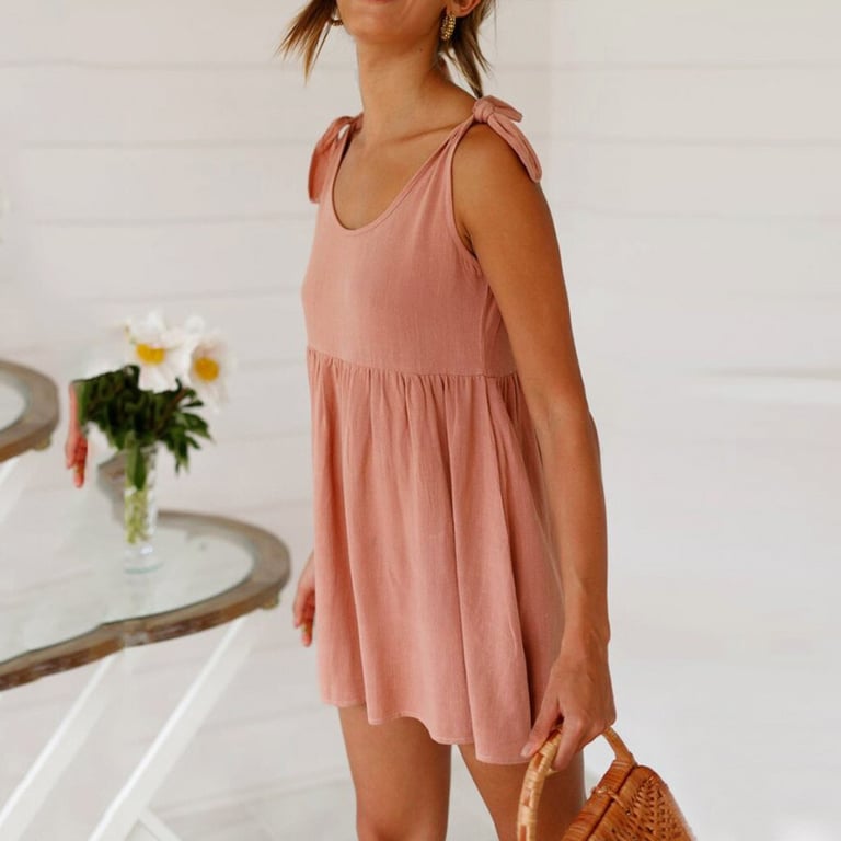 Women's summer strappy dress with tie. Loose short cut with a wide skirt. Available in two colour options.