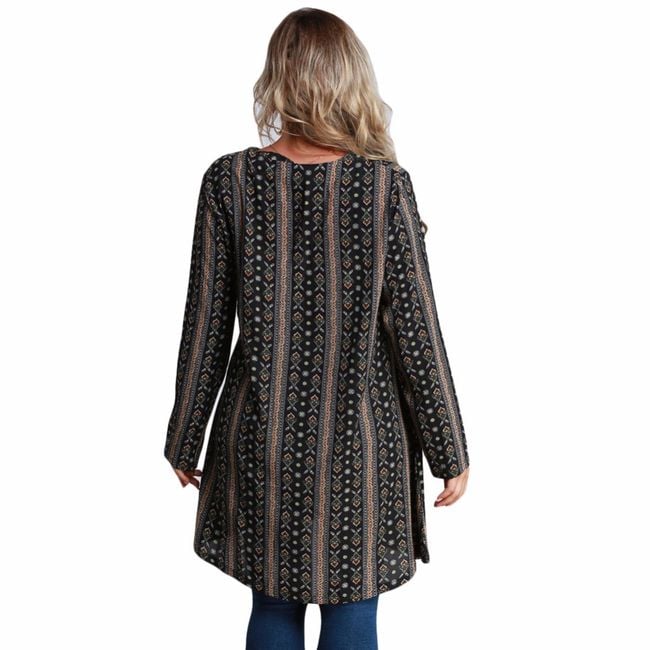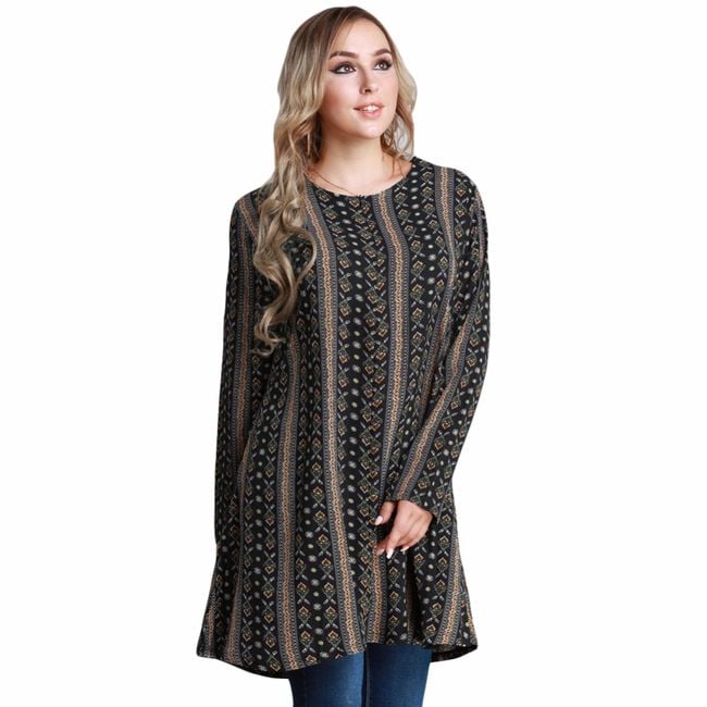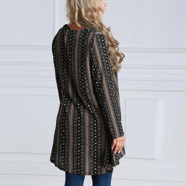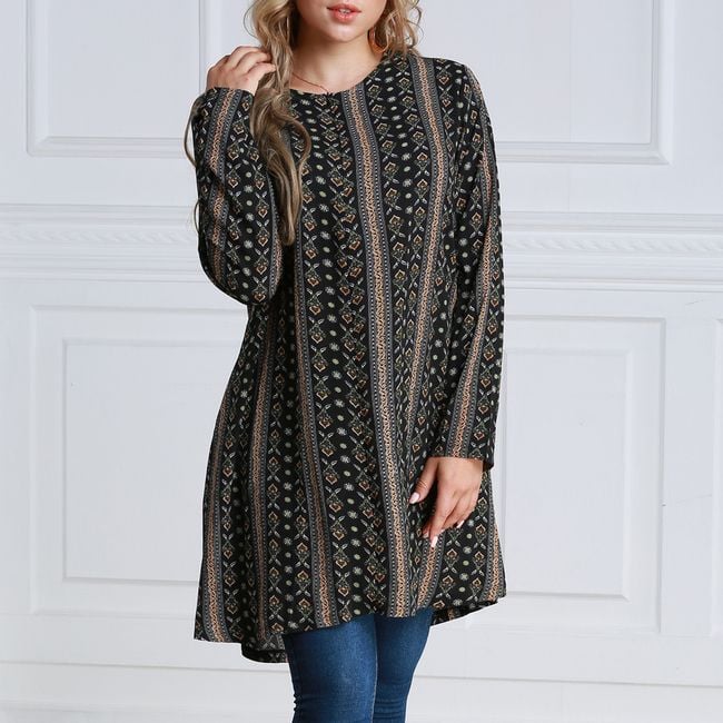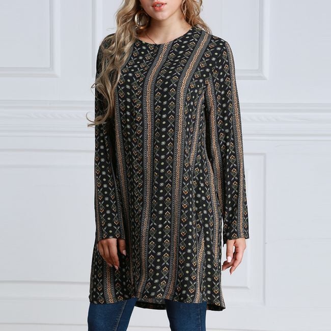 The loose-fitting blouse will be an amazing piece in which we will feel extremely comfortable! It is decorated with patterns and has a length that reaches the knees.