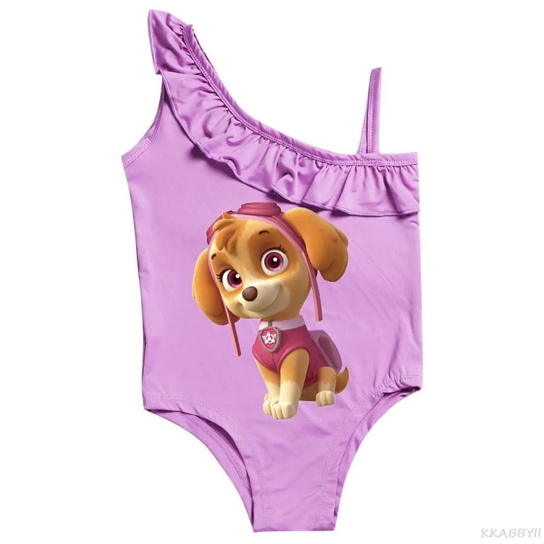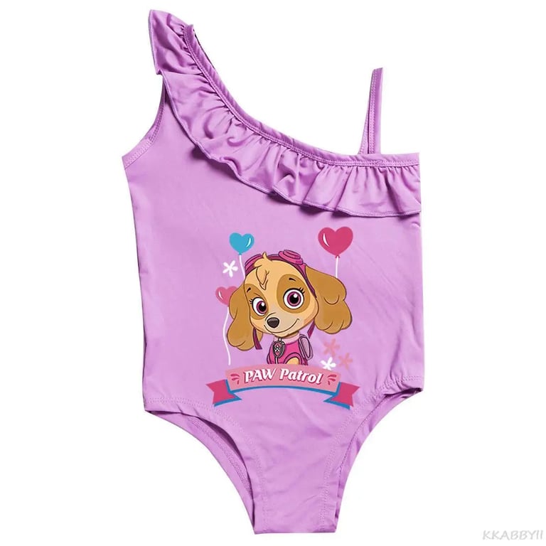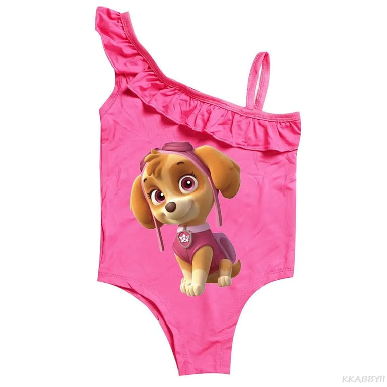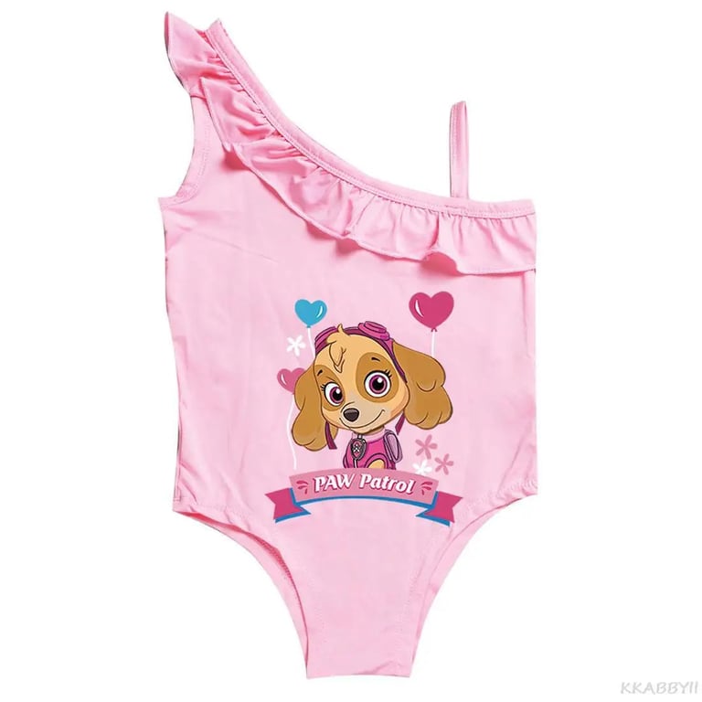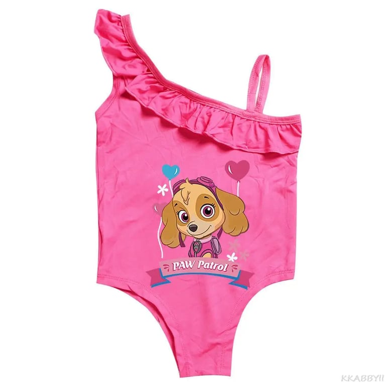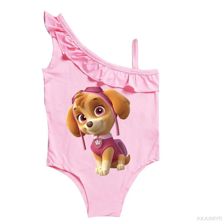 Paw Patrol girls' swimsuit. Material: 100% polyester Size chart (cm) Size | Swimsuit length | Bust circumference | Recommended height 100 | 51 | 56 | 90 - 100 110 | 102 | 58 | 100 - 110 120 | 107 | 60 | 110 - 120 130 | 112 | 62 | 120 - 130 140 | 122 | 64 | 130 - 140