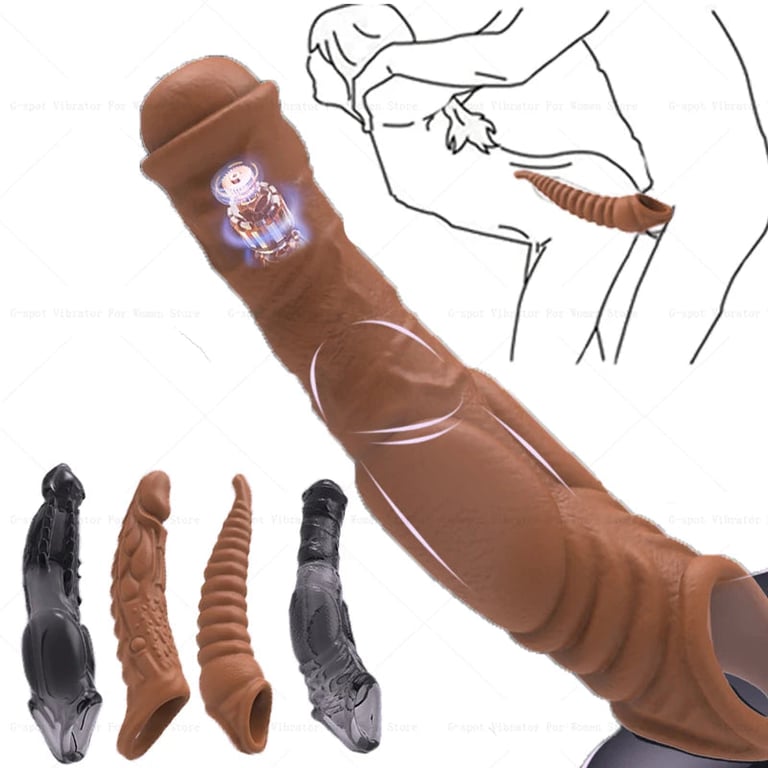 Reusable silicone penis sleeve with a textured design for penis extension and enhanced sexual stimulation.