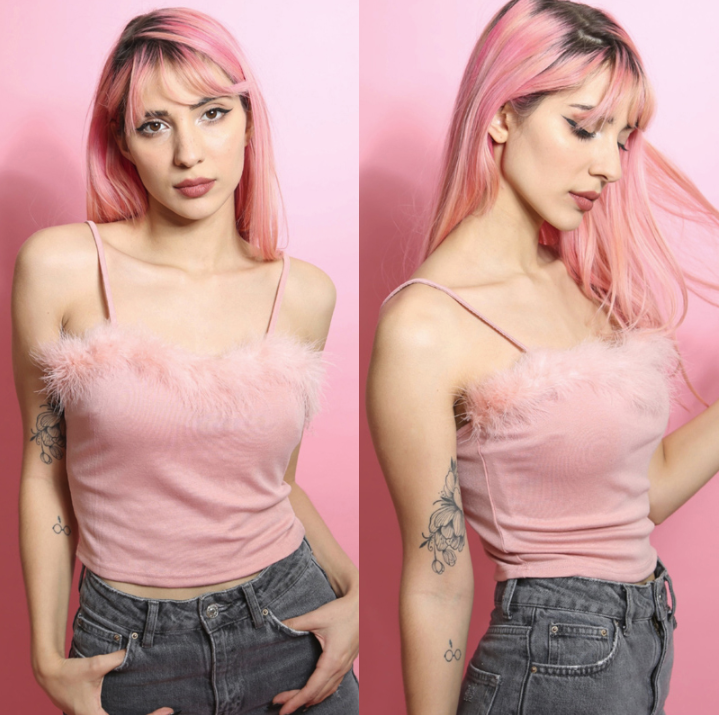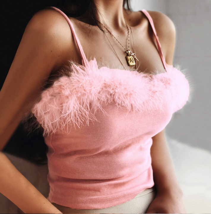 Pink beautiful short women's top with feathers