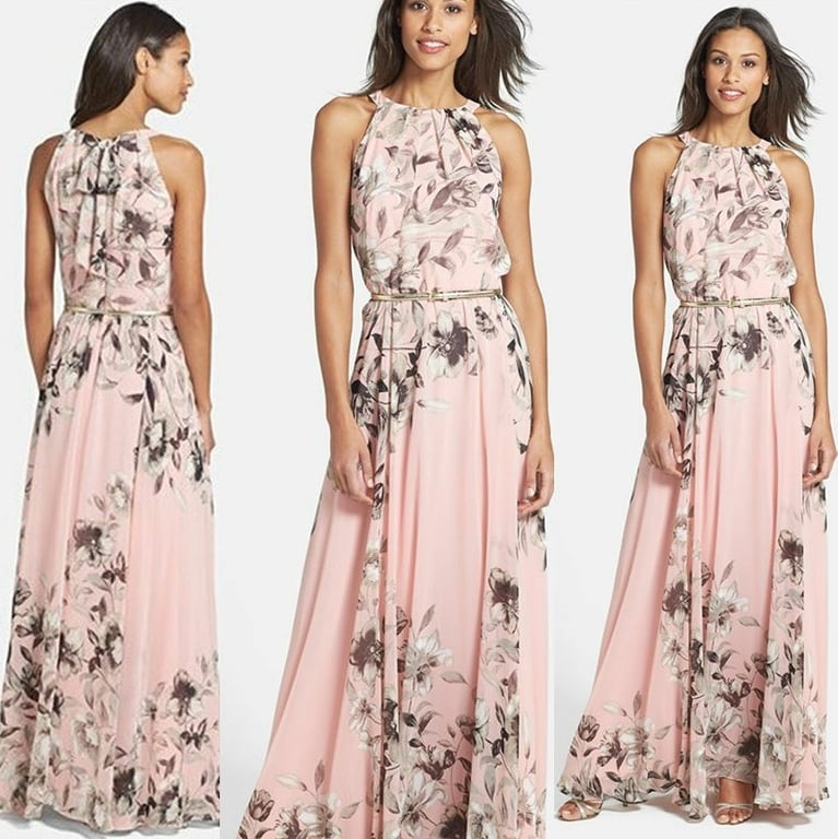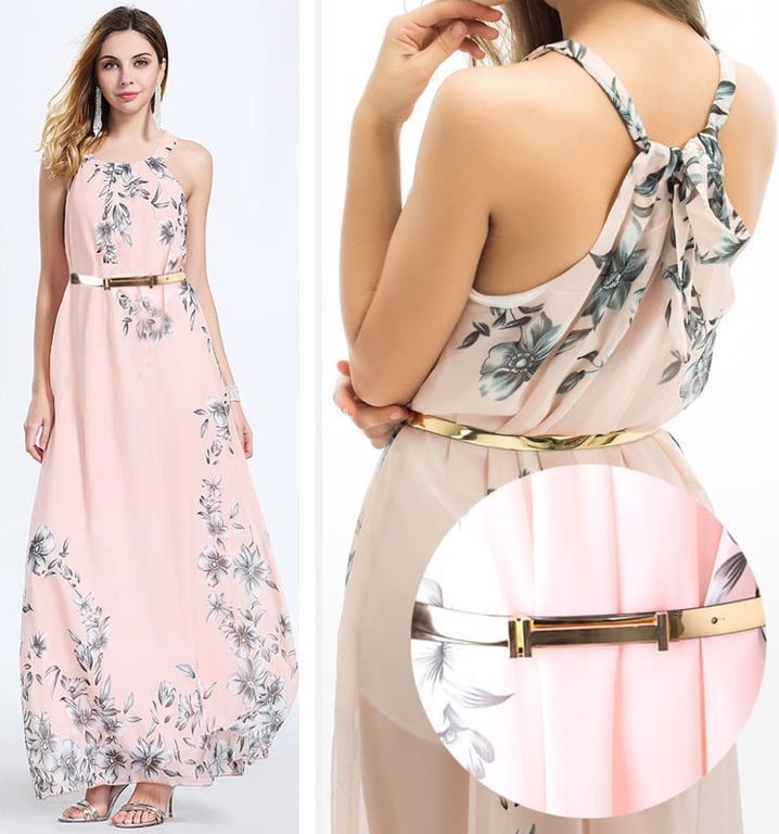 Romantic summer maxi dress in pink with a floral pattern.