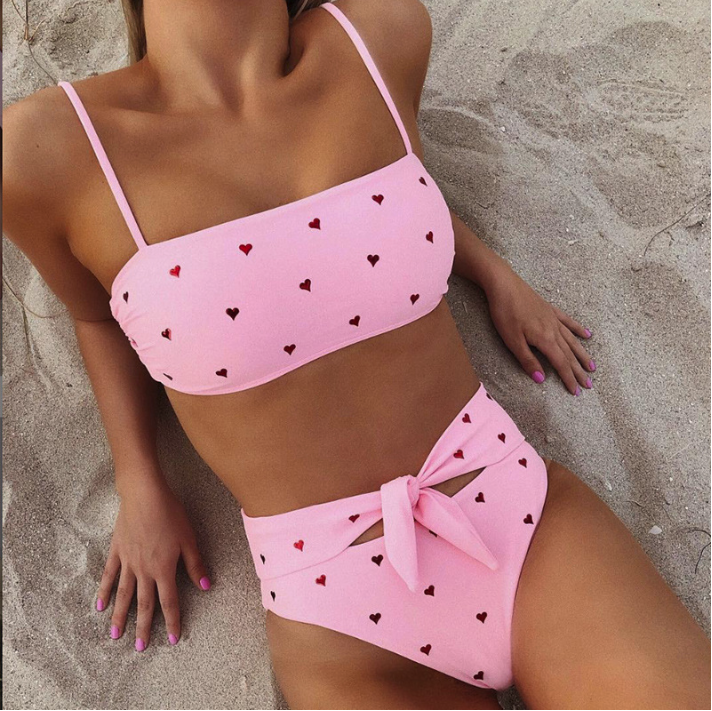 Pink two-piece cute women's swimsuit with hearts and a knot.