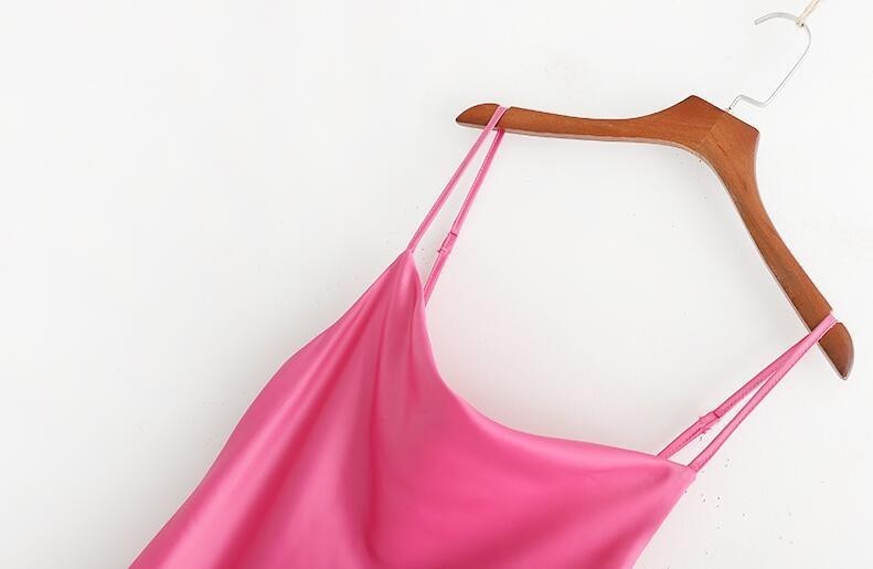 Smooth shiny material with a satin look, adjustable straps.