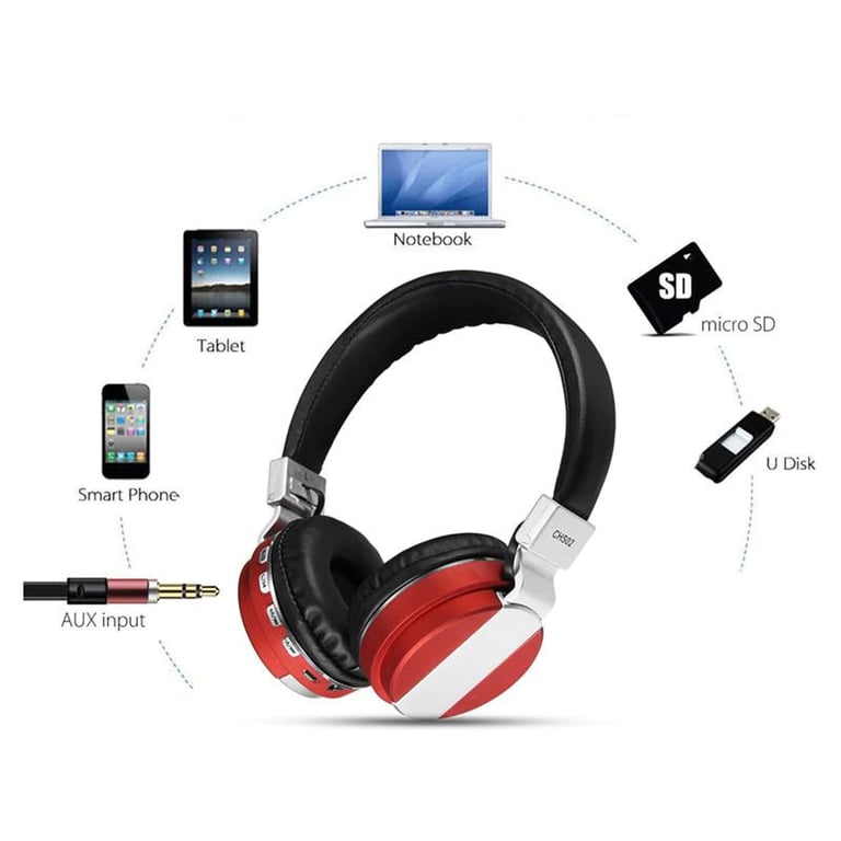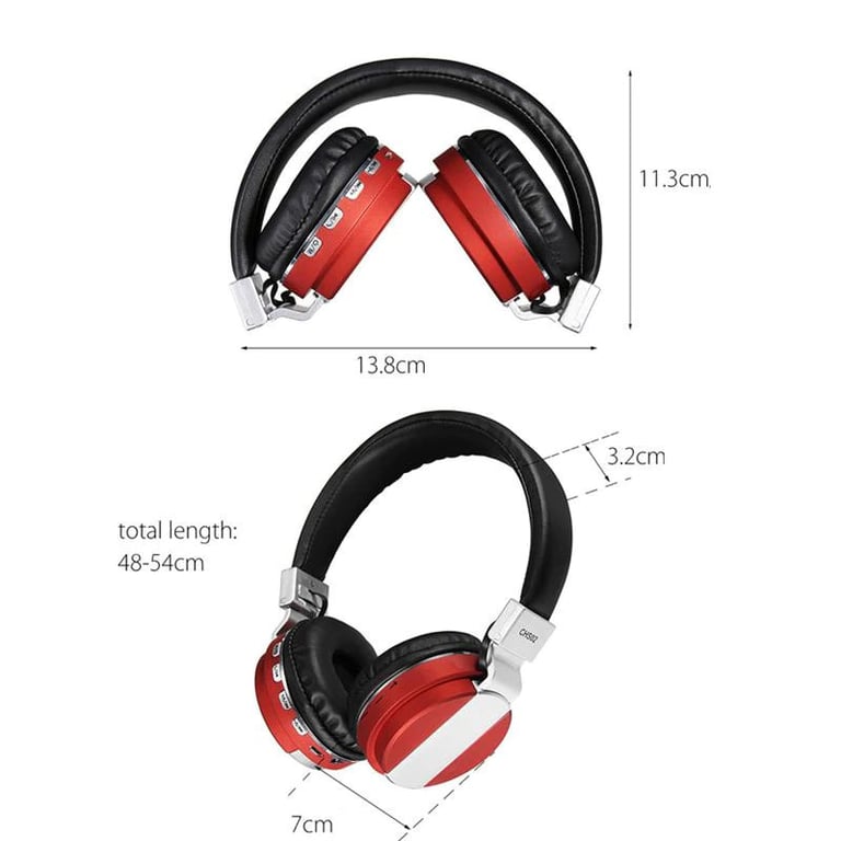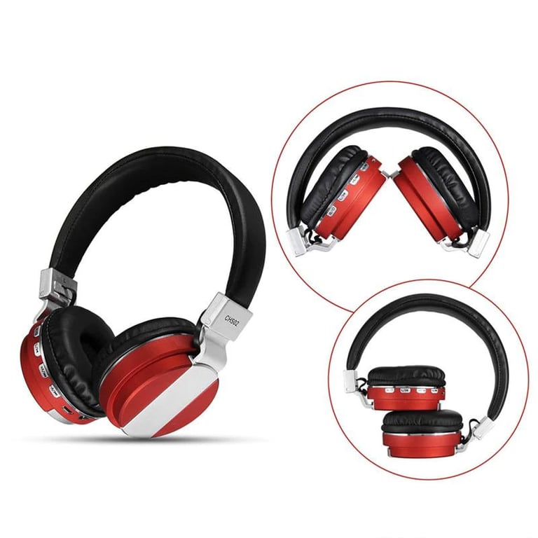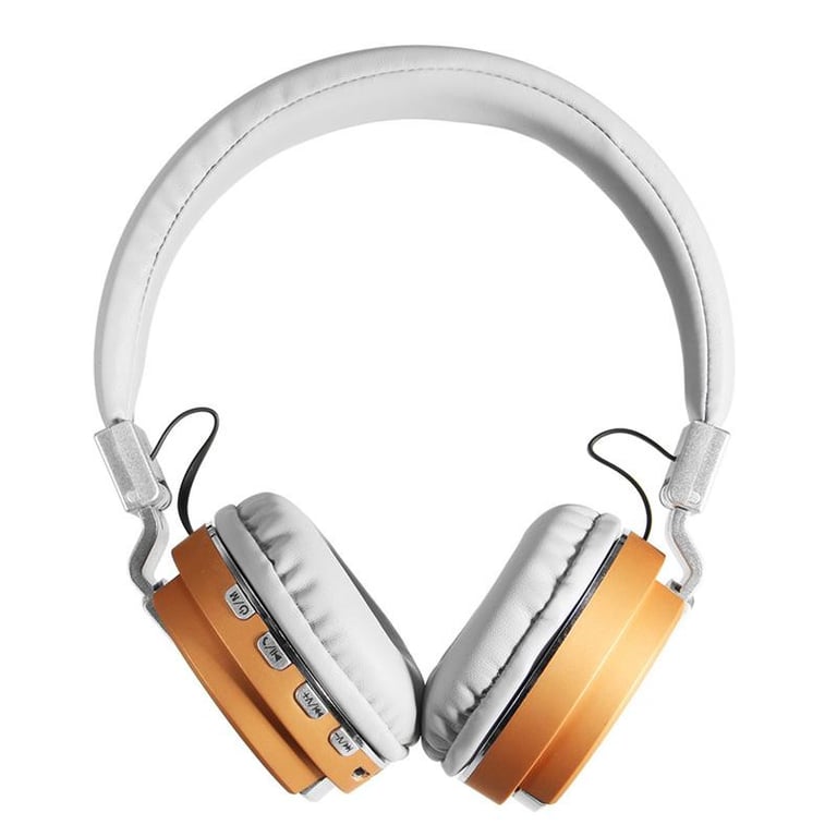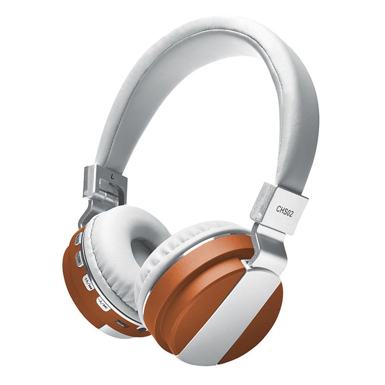 Large wireless headphones with Bluetooth function, microphone, and FM player. Powered by USB. Battery life of up to 5 hours. Available in four colour variants.