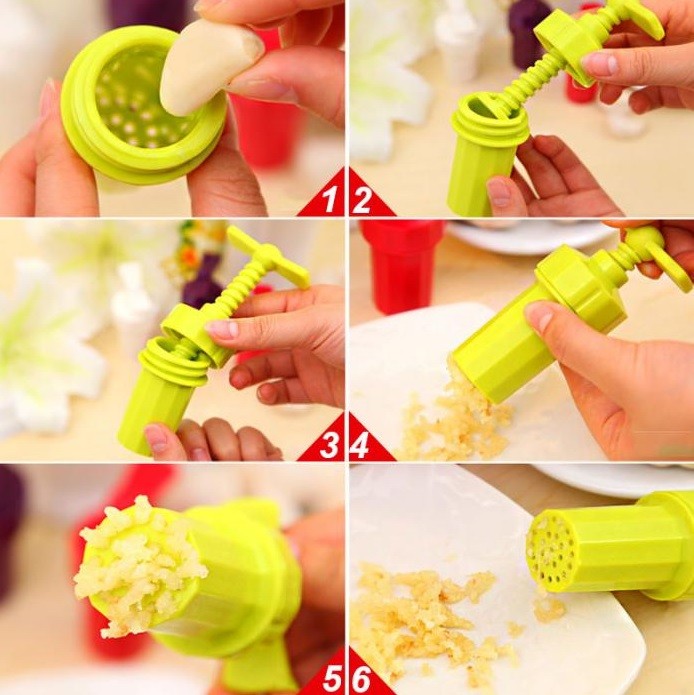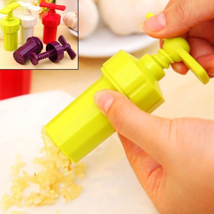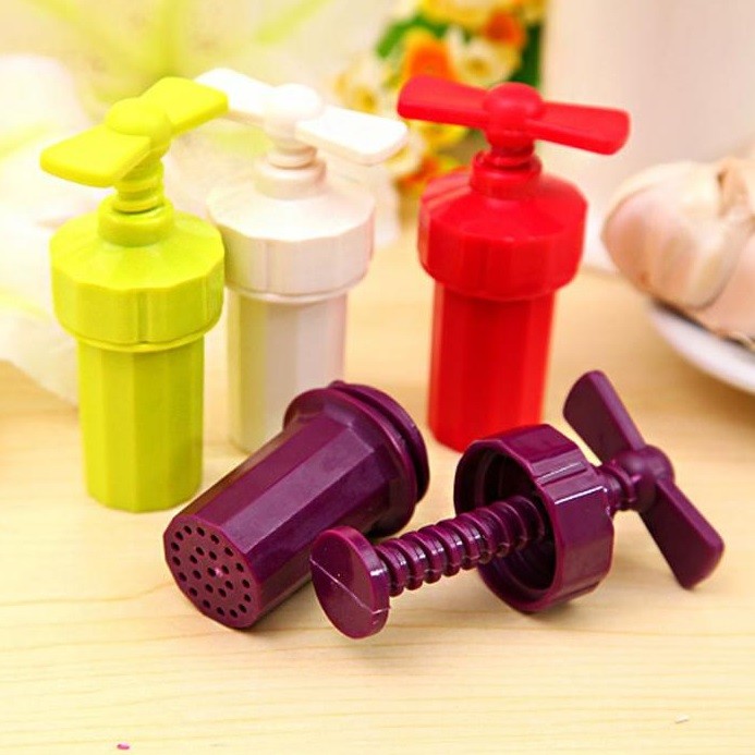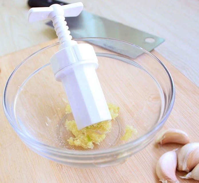 Plastic garlic press with a screw mechanism.