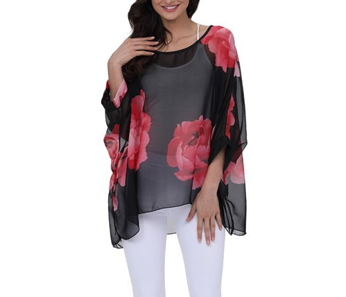 Women's loose blouse in plus size. Black colour with red flowers.