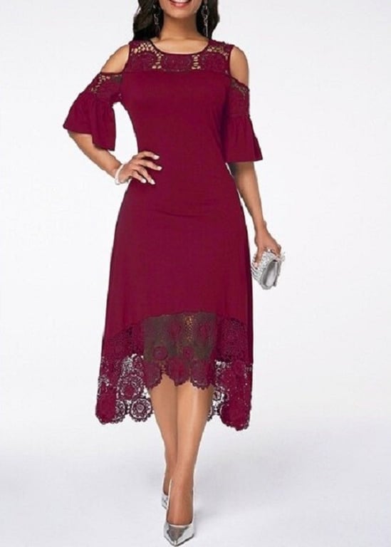 Elegant women's dress below the knee adorned with lace.