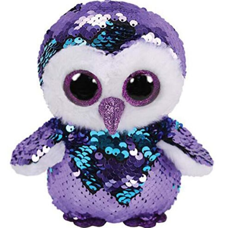 Children's plush toy in the shape of a cute owl. Purple with sparkling sequins. Height approximately 15 cm.
