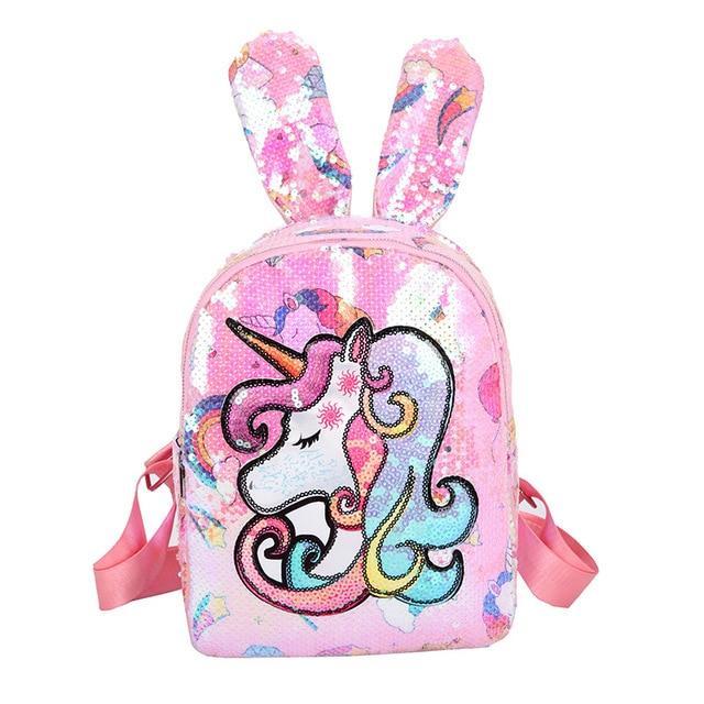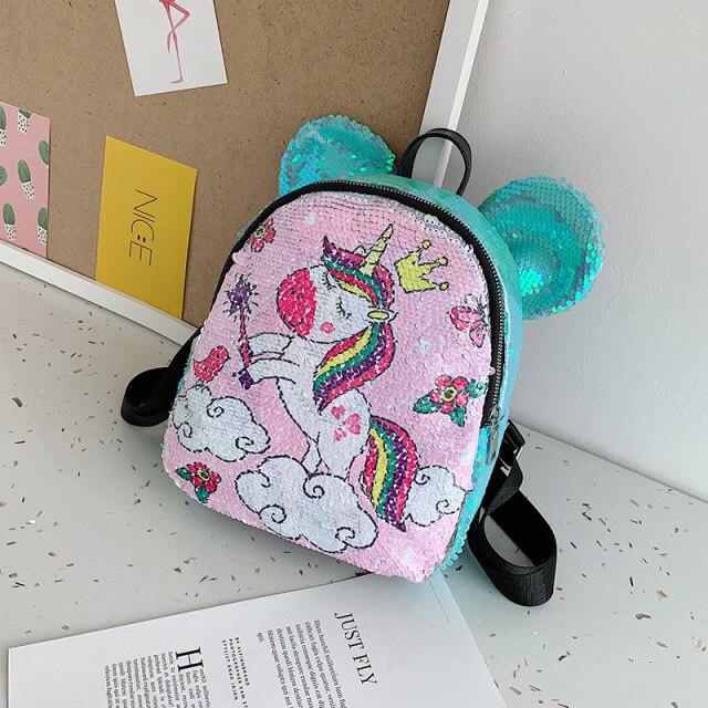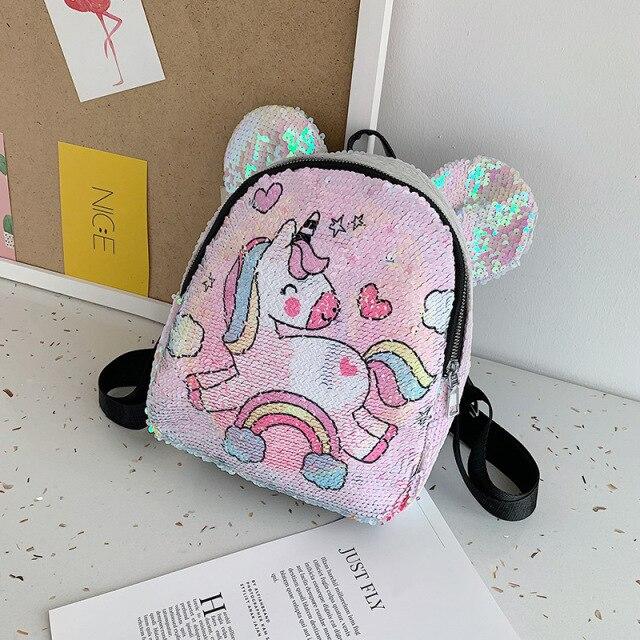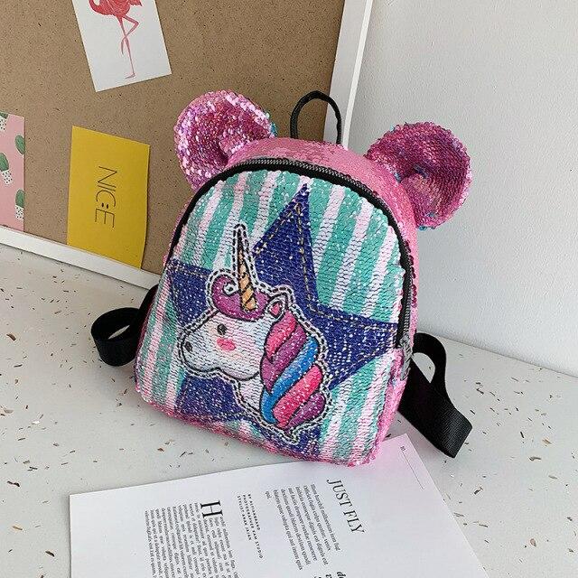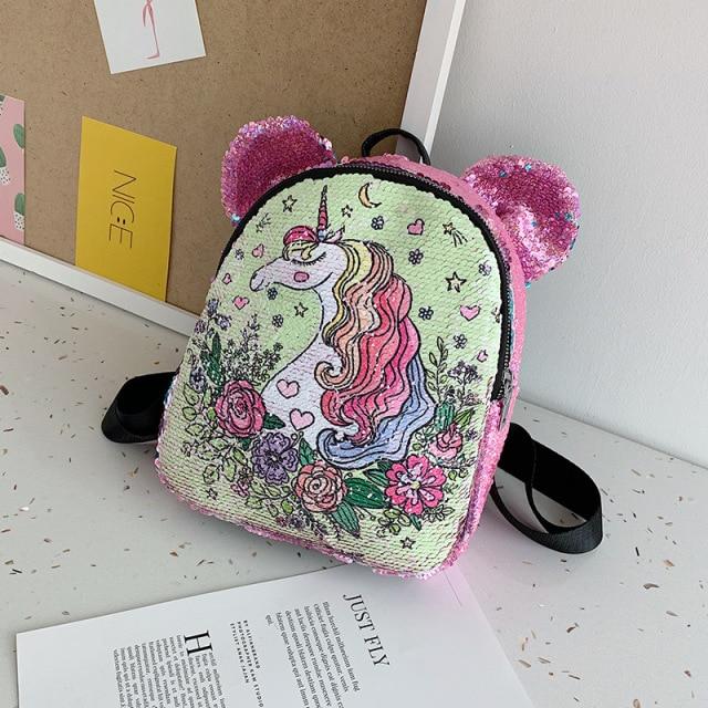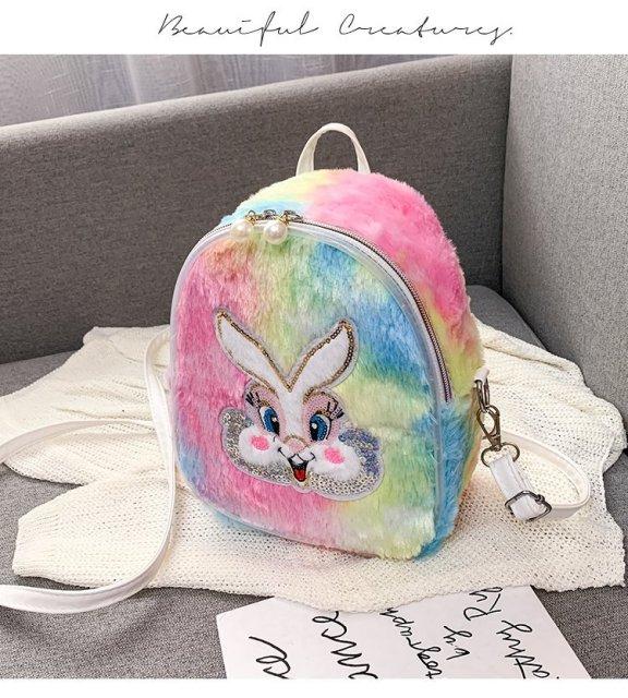 Plush backpack with a unicorn and other animal images. Several variants are available.