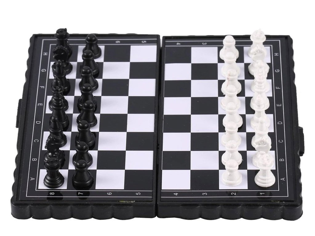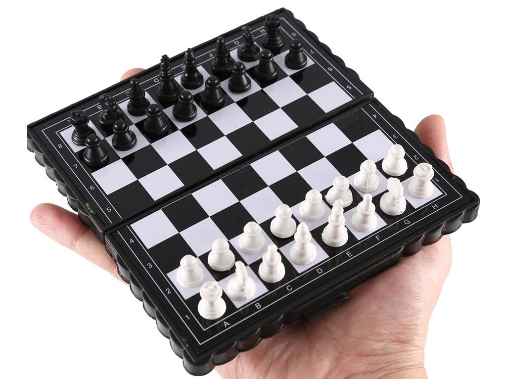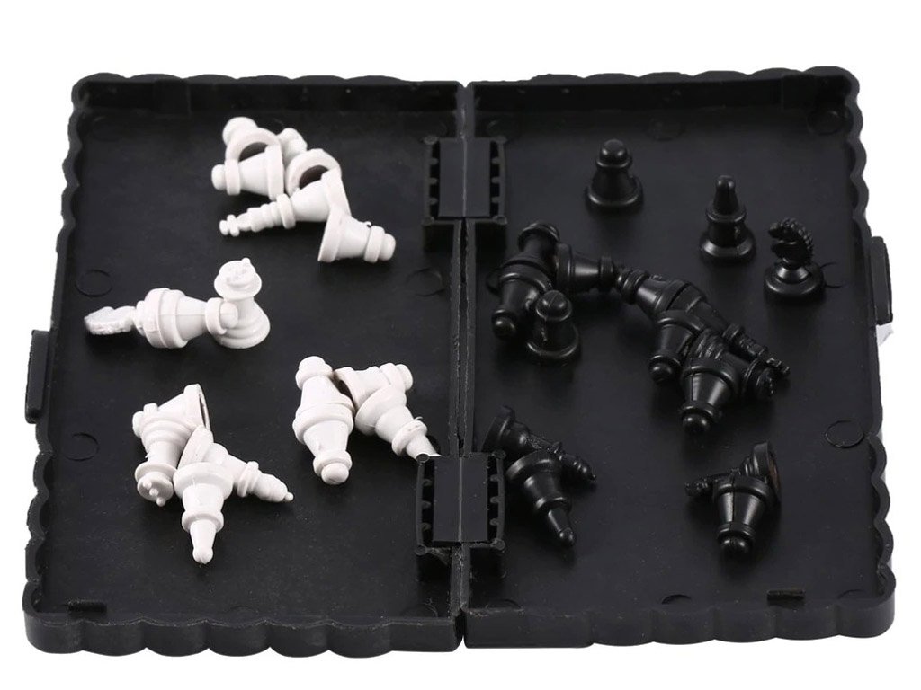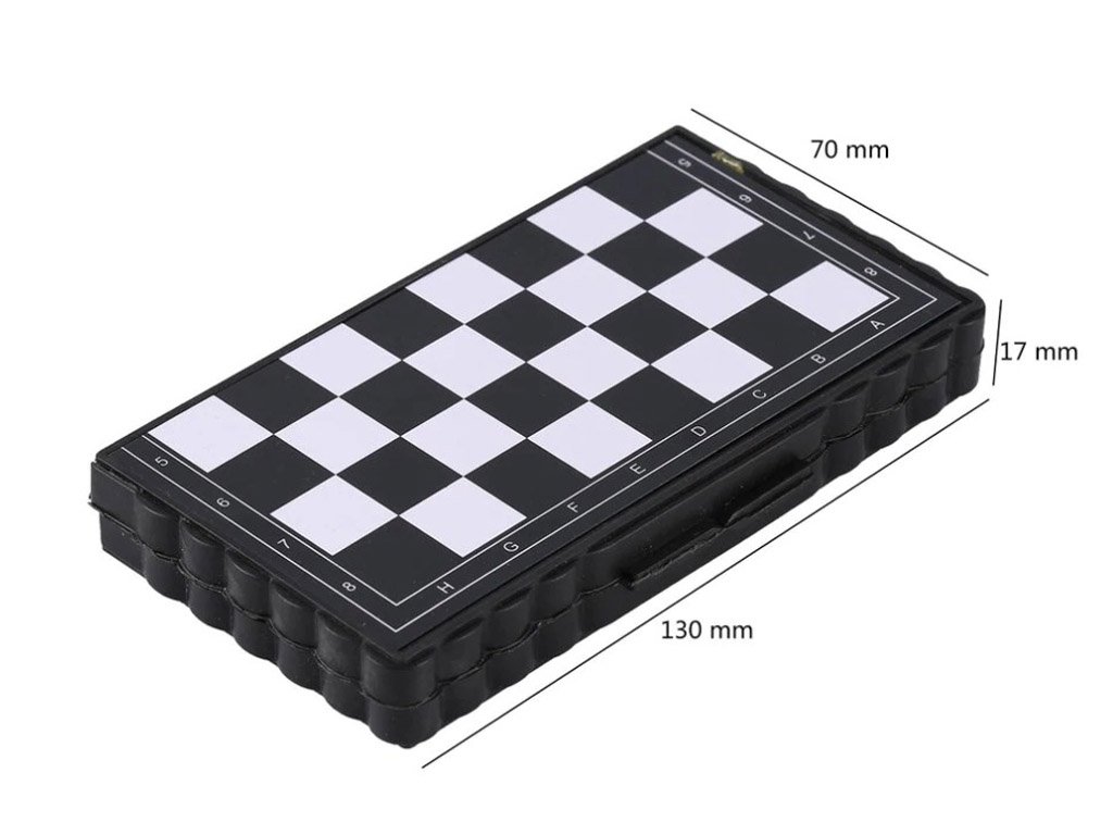 Small pocket chess in classic black and white design with a chessboard that also serves as a box for the pieces. Chess improves strategic, logical thinking and foresight. Pocket chess is ideal for enthusiasts of this sport, as its small size allows you to take it with you wherever you go.