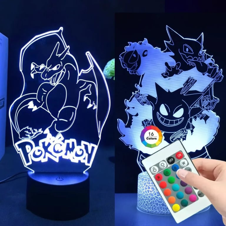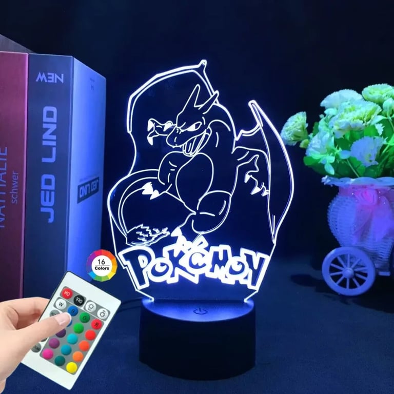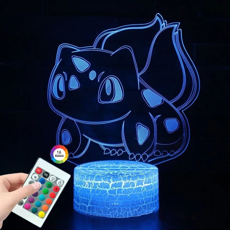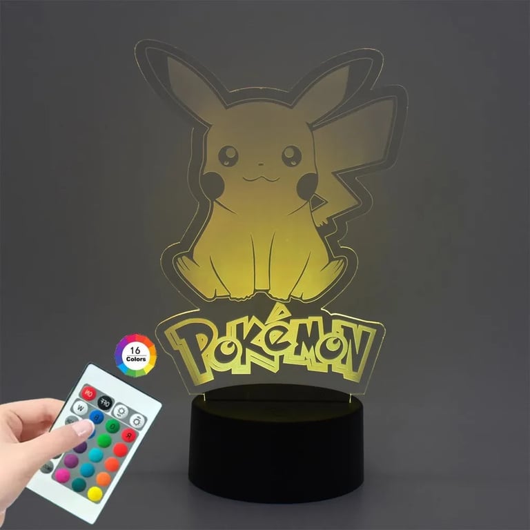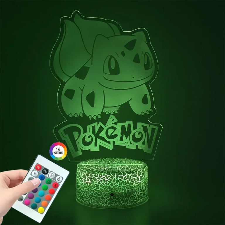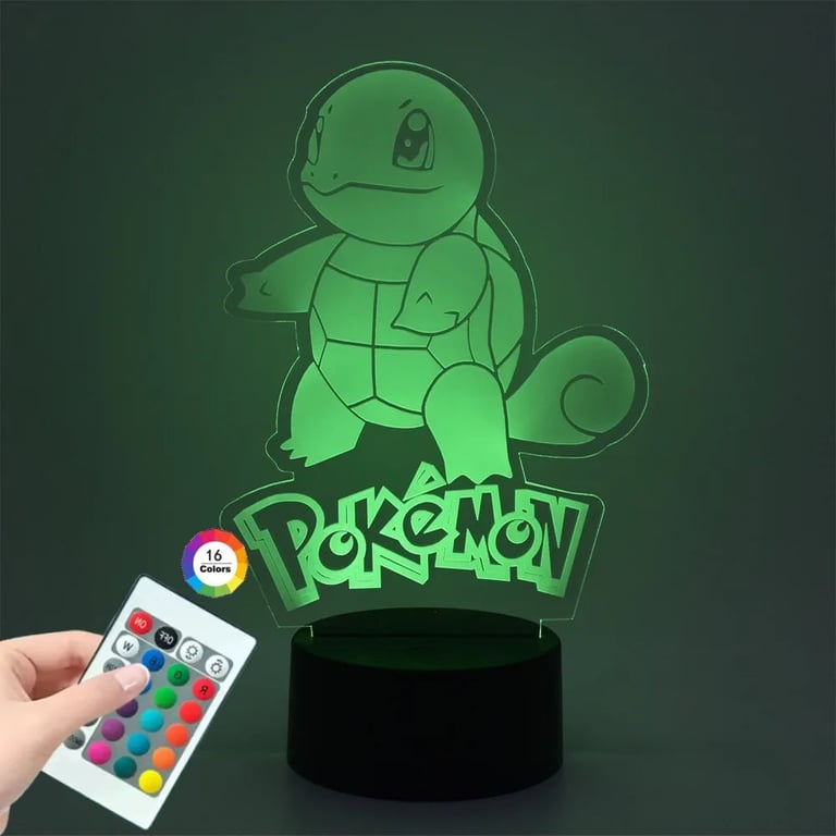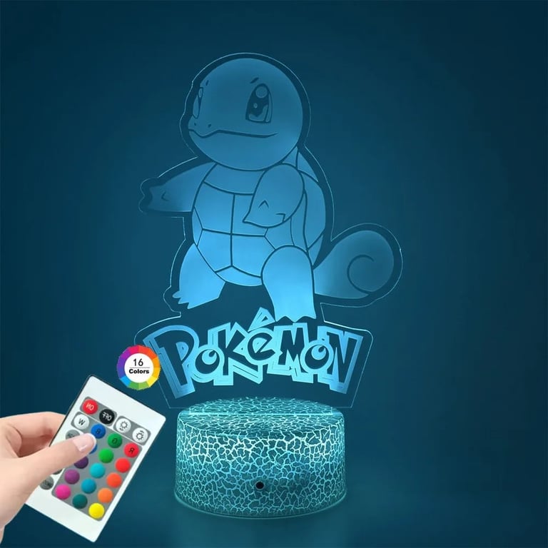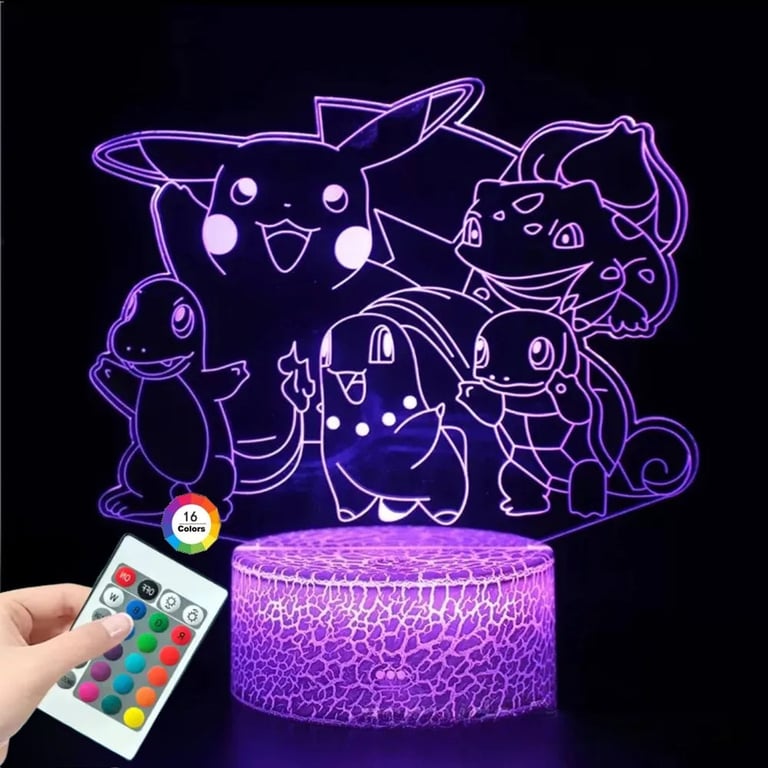LED night light featuring Pokémon motifs is among stylish, colourful decorations for a child's room. The engraved acrylic panel displays favourite characters, for example Pikachu, Charmander, Squirtle, Bulbasaur and others, and thanks to energy-saving LEDs it shines in up to 16 different colours. The colours and effects can be controlled with the remote control or by touch, and the lamp is powered via USB.