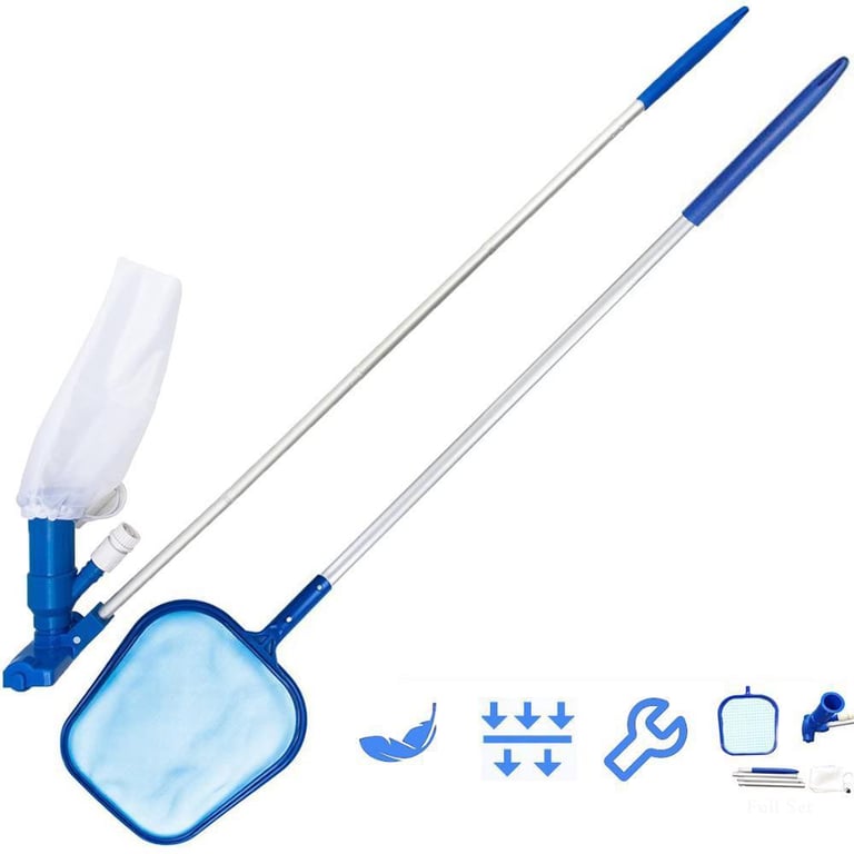 Pool cleaning set. The set includes a 48-inch telescopic aluminium pole for pools up to 16 feet. Also included are interchangeable vacuum and brush heads for collecting debris from the pool.