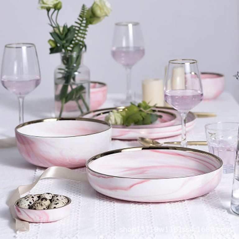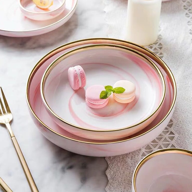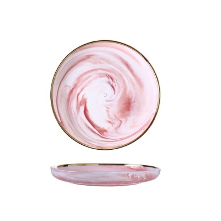 A plate with a marbled pattern and gold edging.