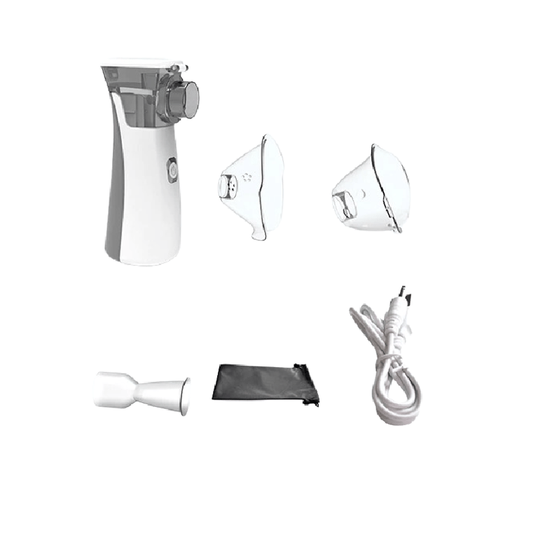 Package contents: 1x inhaler, 1x adult mask, 1x children's mask, 1x mouthpiece, 1x storage bag, 1x power cable