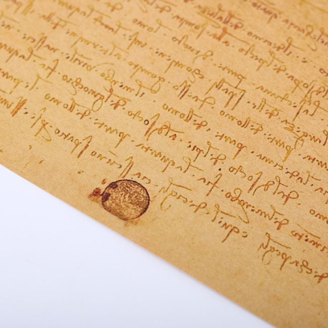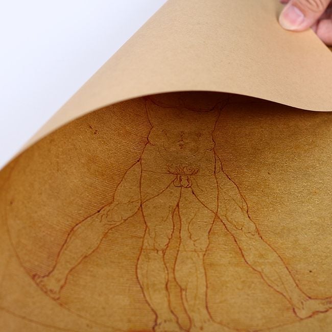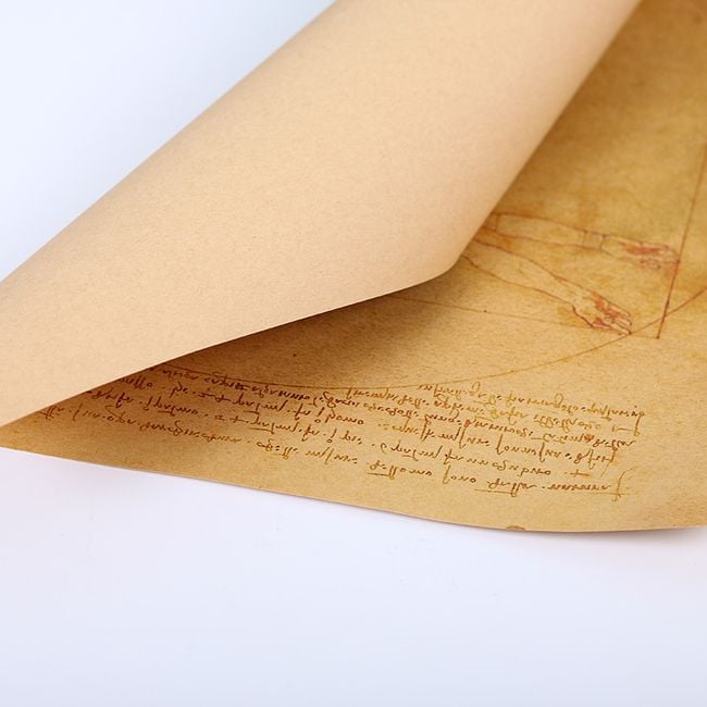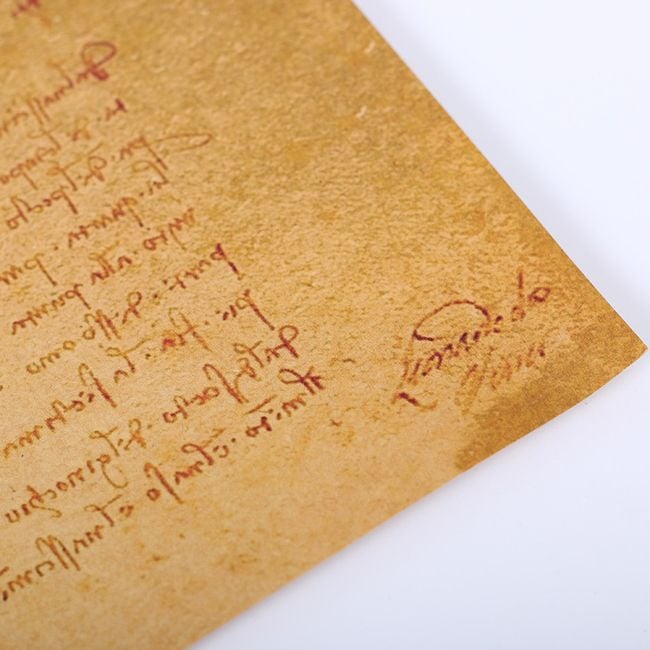 Paper poster featuring a drawing and handwriting by Leonardo da Vinci.