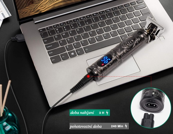 The trimmer charges via a USB cable, with a battery life of up to 120 minutes, making it ideal for travel.