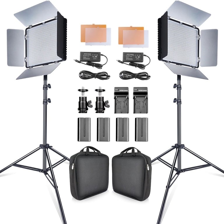 Package contents: 2x light, 2x orange filter, 2x transparent filter, 2x tripod, 4x NP-F550 batteries, 2x charger, 2x power adapter, 2x case