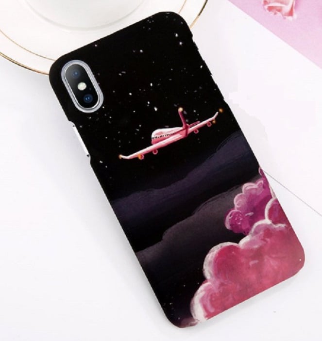 This protective case features a print of a pink airplane flying through the night sky with pink clouds.
