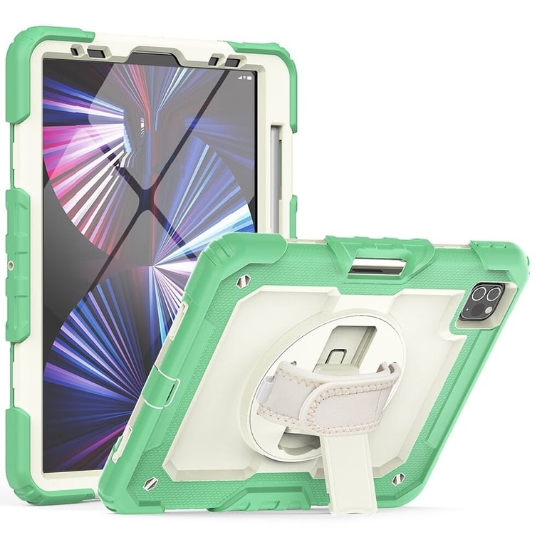 Check out this quality case! Ideal for your travels and home use. It fits your device well. It has openings for connectors. The hand strap rotates 360°. The inner hard polycarbonate with an outer soft silicone coating offers maximum protection. Adjustable hand strap. There is a space for the Apple Pencil on the back.