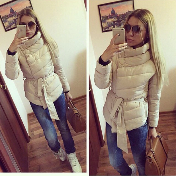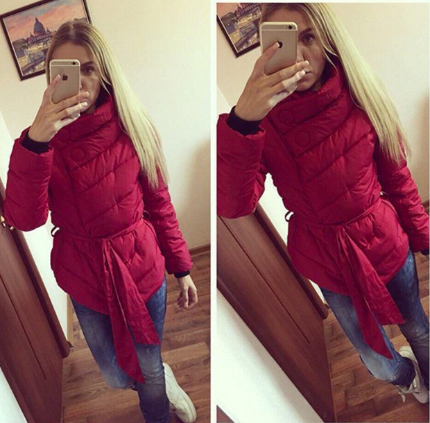 Quilted down warm women's winter jacket with a belt