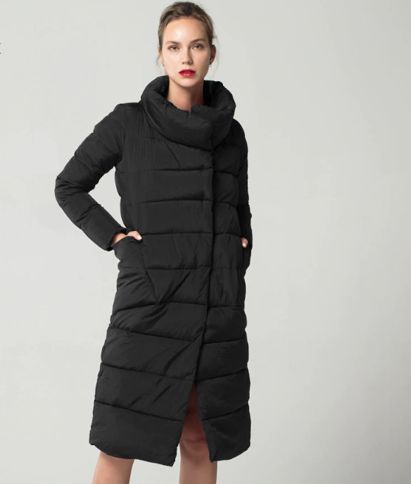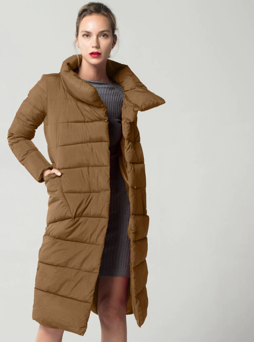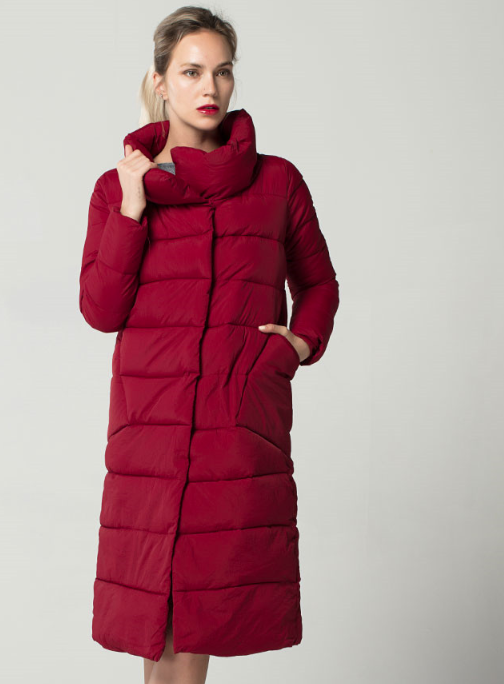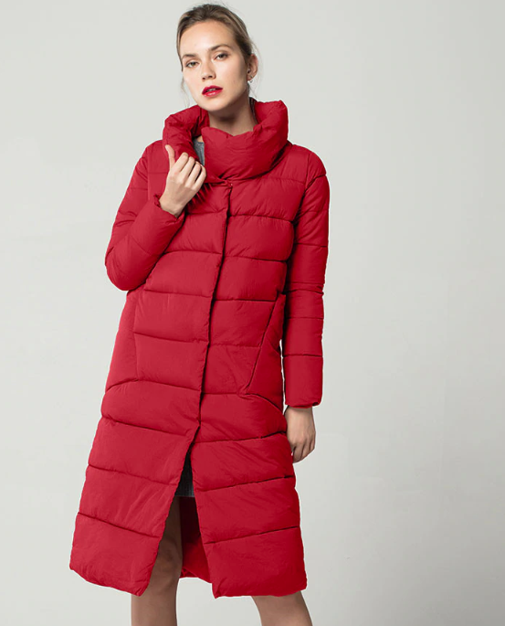 Quilted long warm women's winter coat with a stand-up collar.