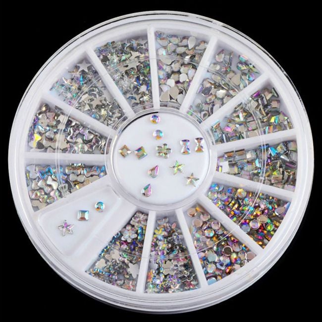 Rainbow-coloured nail stickers featuring up to 6 different shapes. There are stars, drops, flowers, bows, etc. This decoration looks very elegant on the nails.