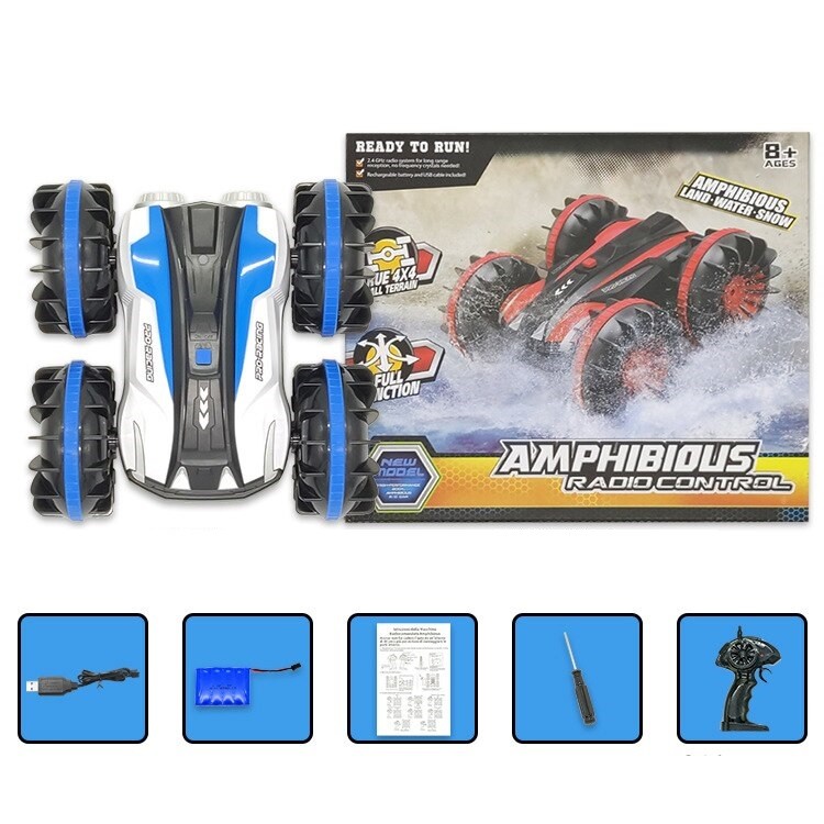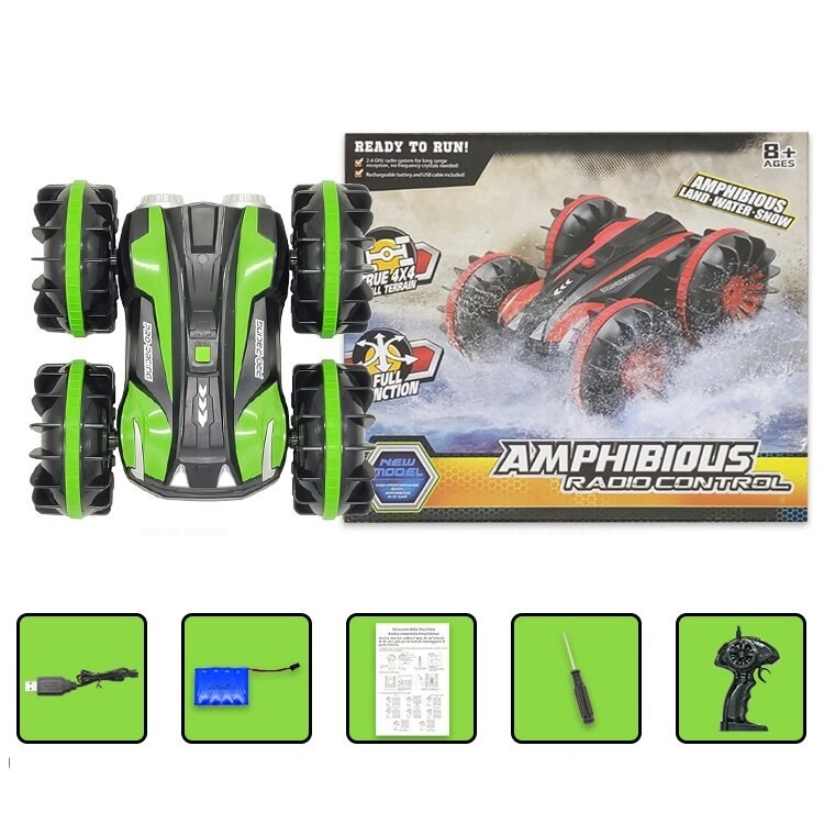 Package contents: 1x car, 1x USB charging cable, 1x 6V battery, 1x 2.4 GHz controller, 1x screwdriver, 1x manual