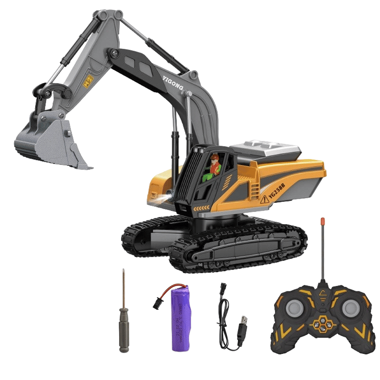 Package Contents: 1x RC excavator, 1x remote control, 1x rechargeable battery, 1x screwdriver, 1x charging USB cable