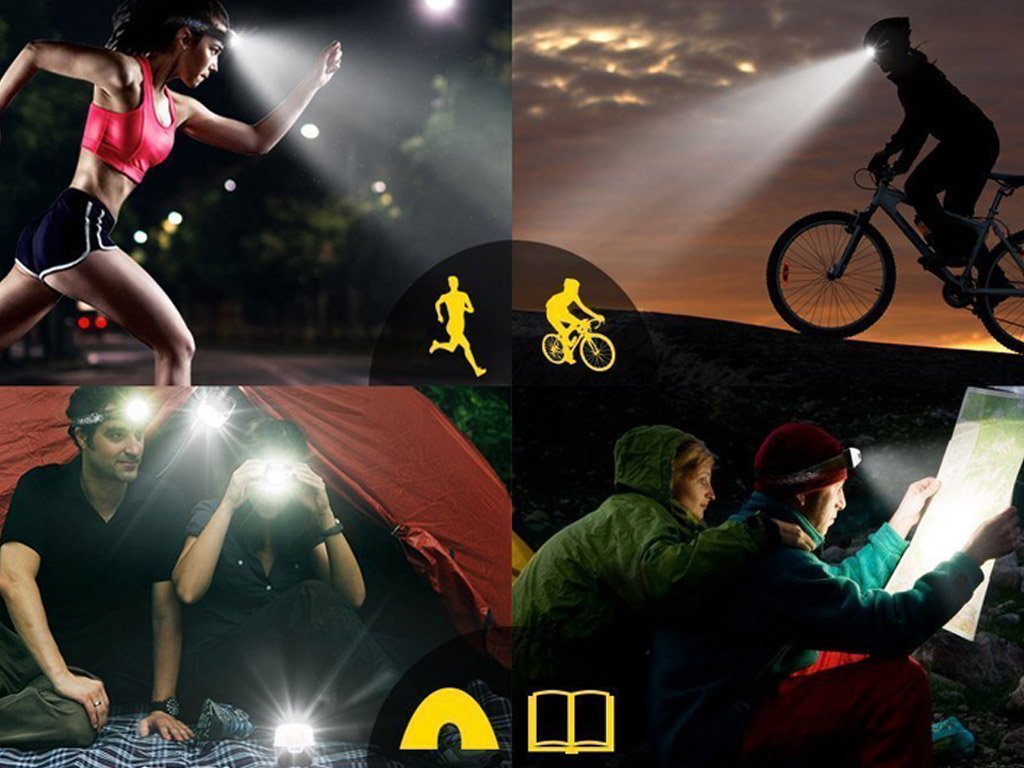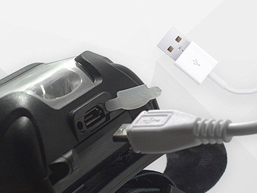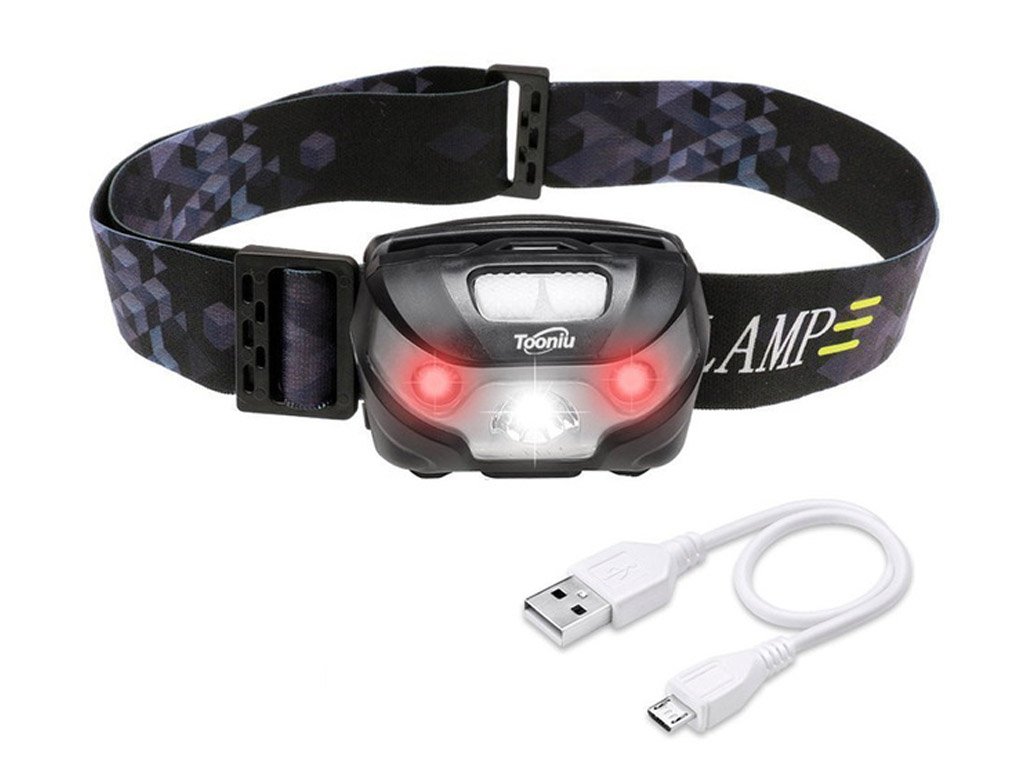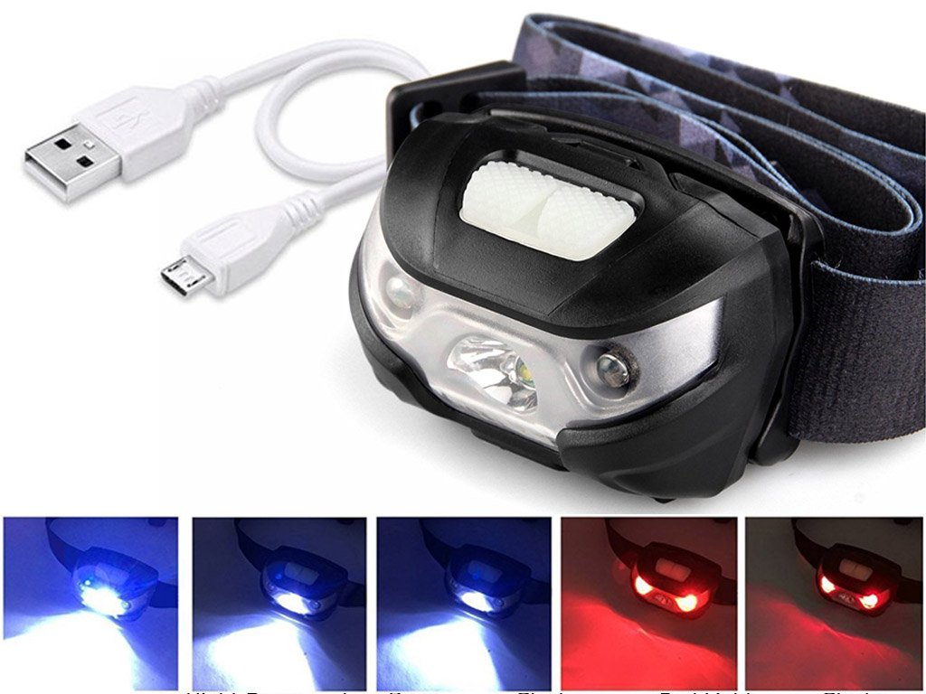 Rechargeable USB headlamp with 3 levels of white lighting – high or low power and strobe, 2 side red LEDs for short distance.