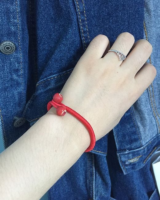 The bracelet is adorned with two beads and is said to bring luck to the wearer.